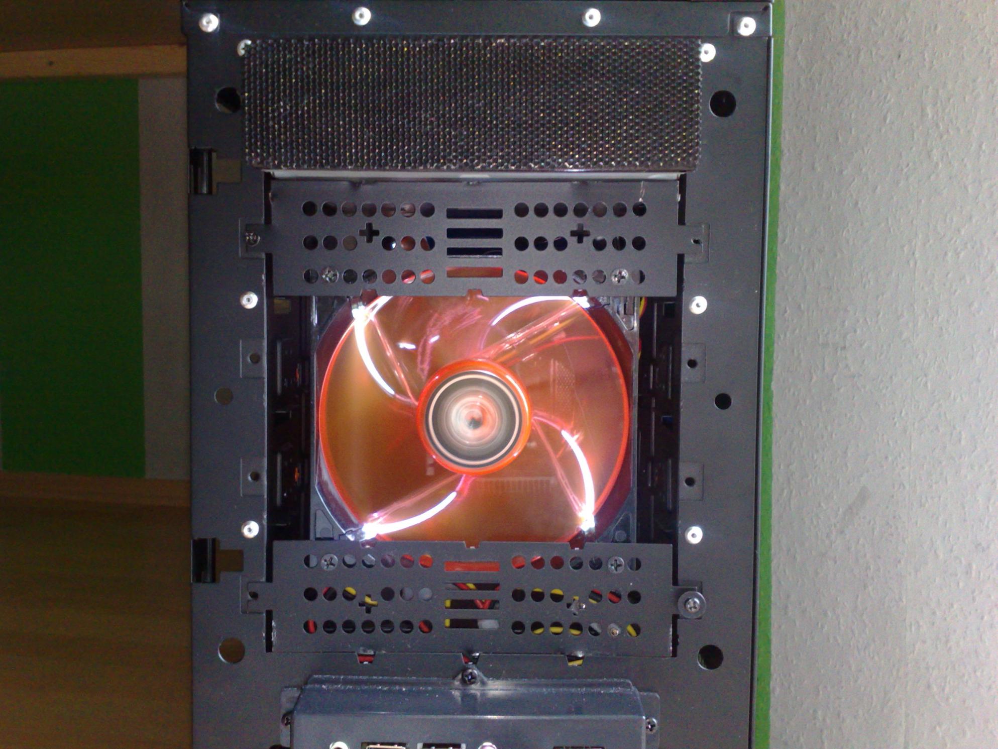 Wenn der Laufwerkskäfig ähnlich Konstruiert ist wie beim Coolermaster 690/590 dann dürfte ein 120mm Lüfter in 3 Schächte passen.