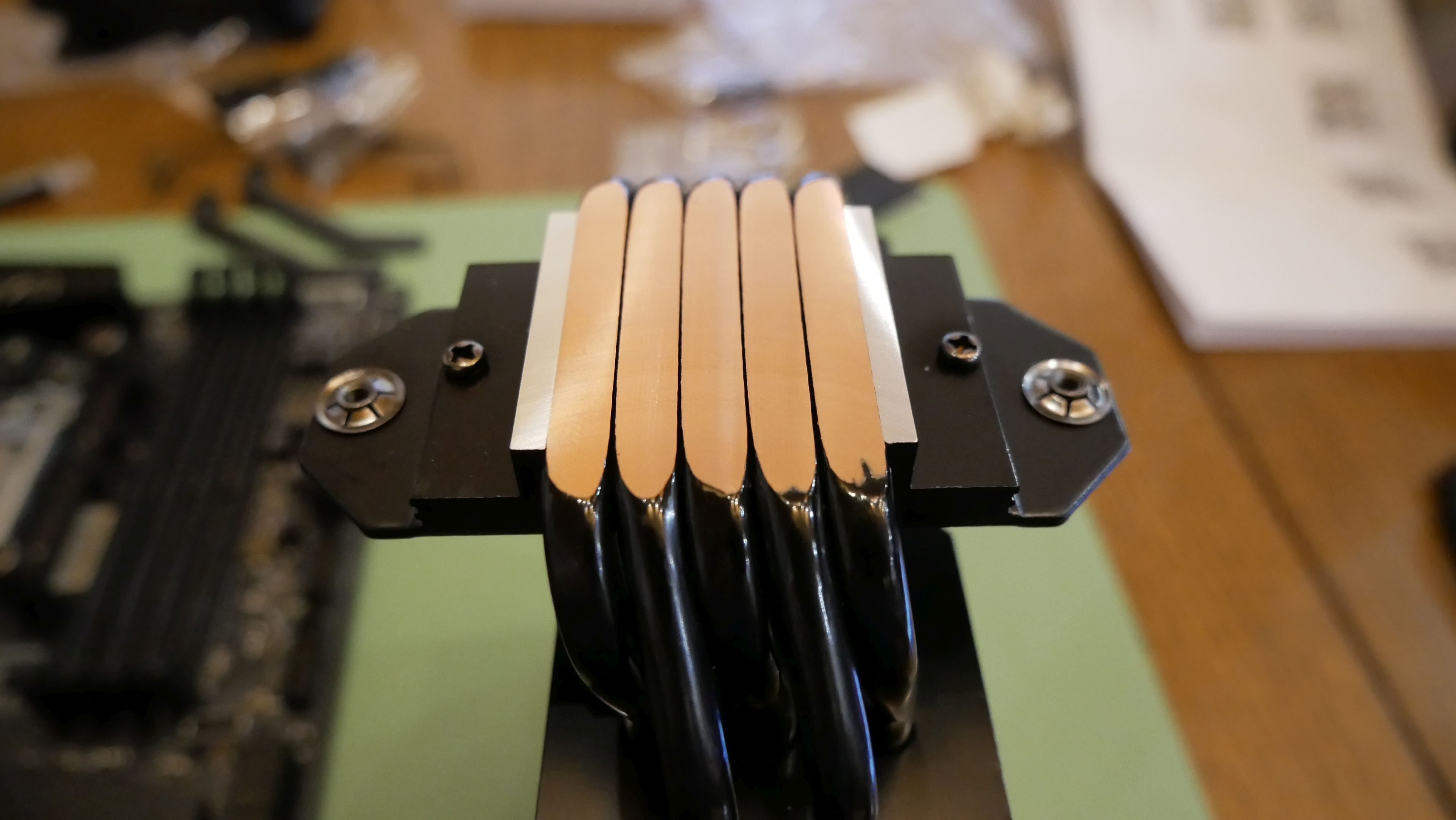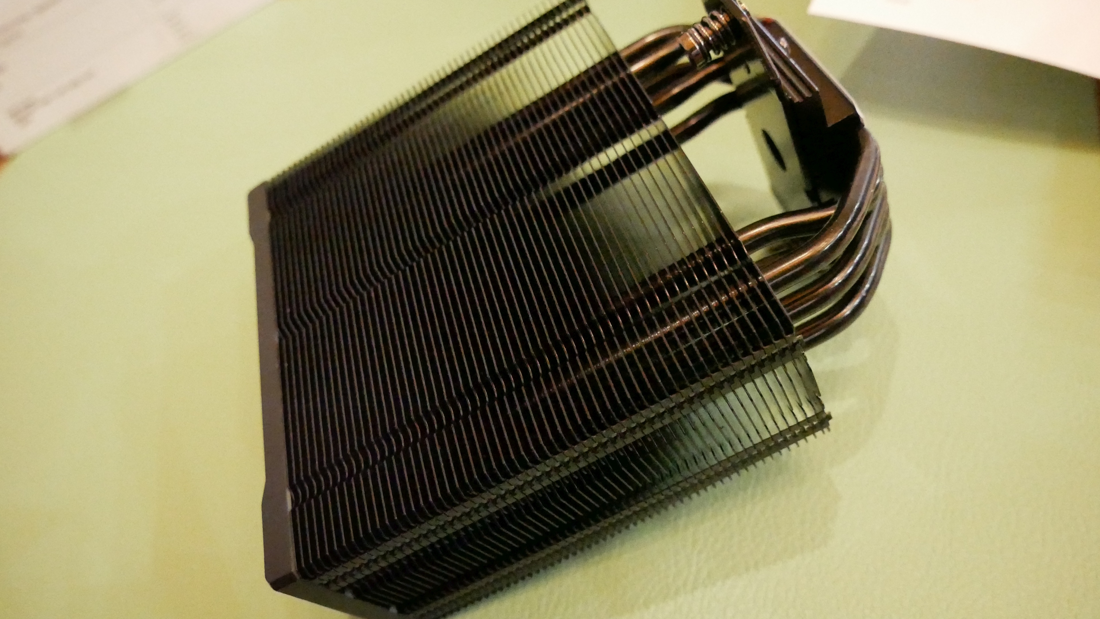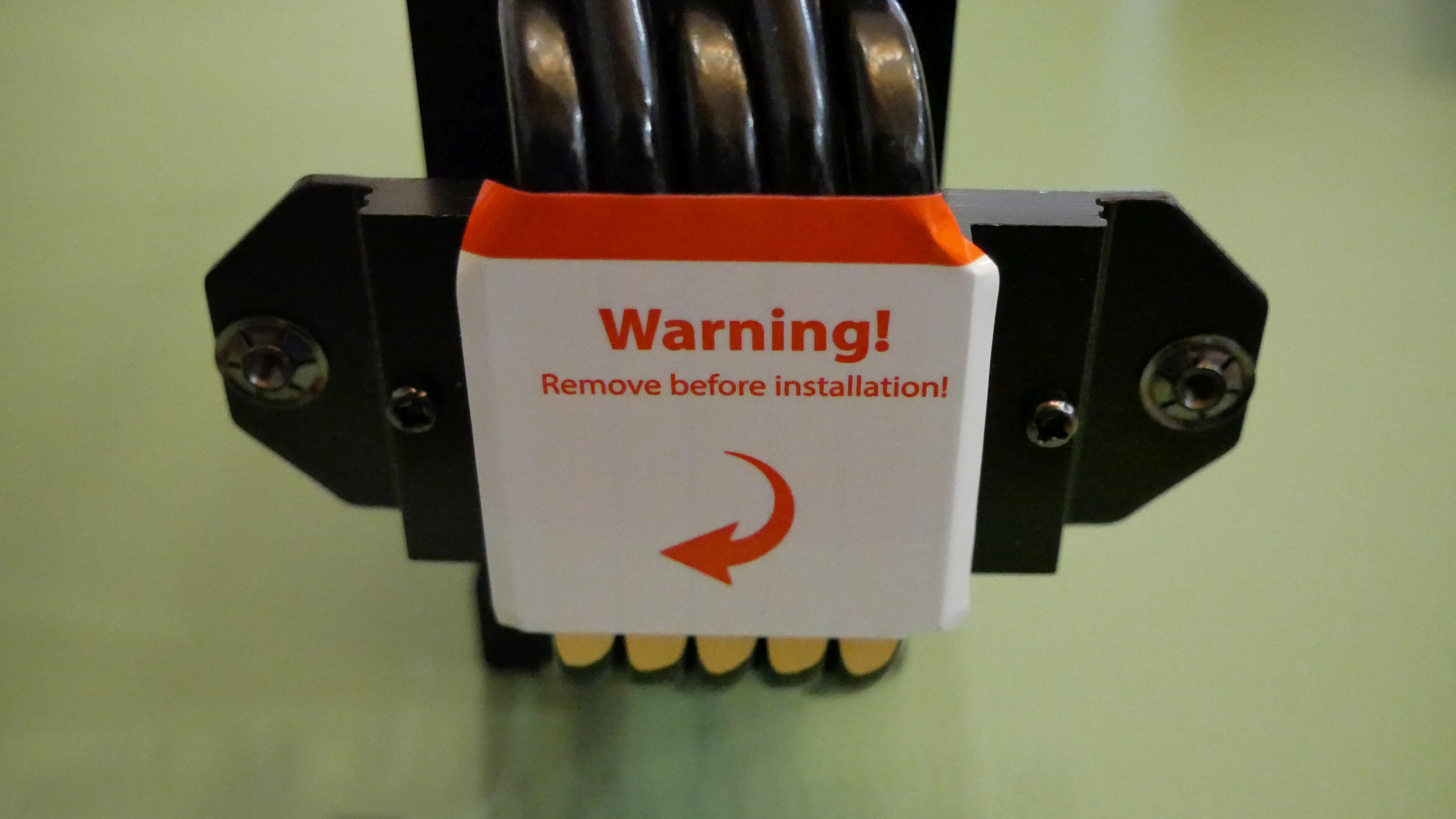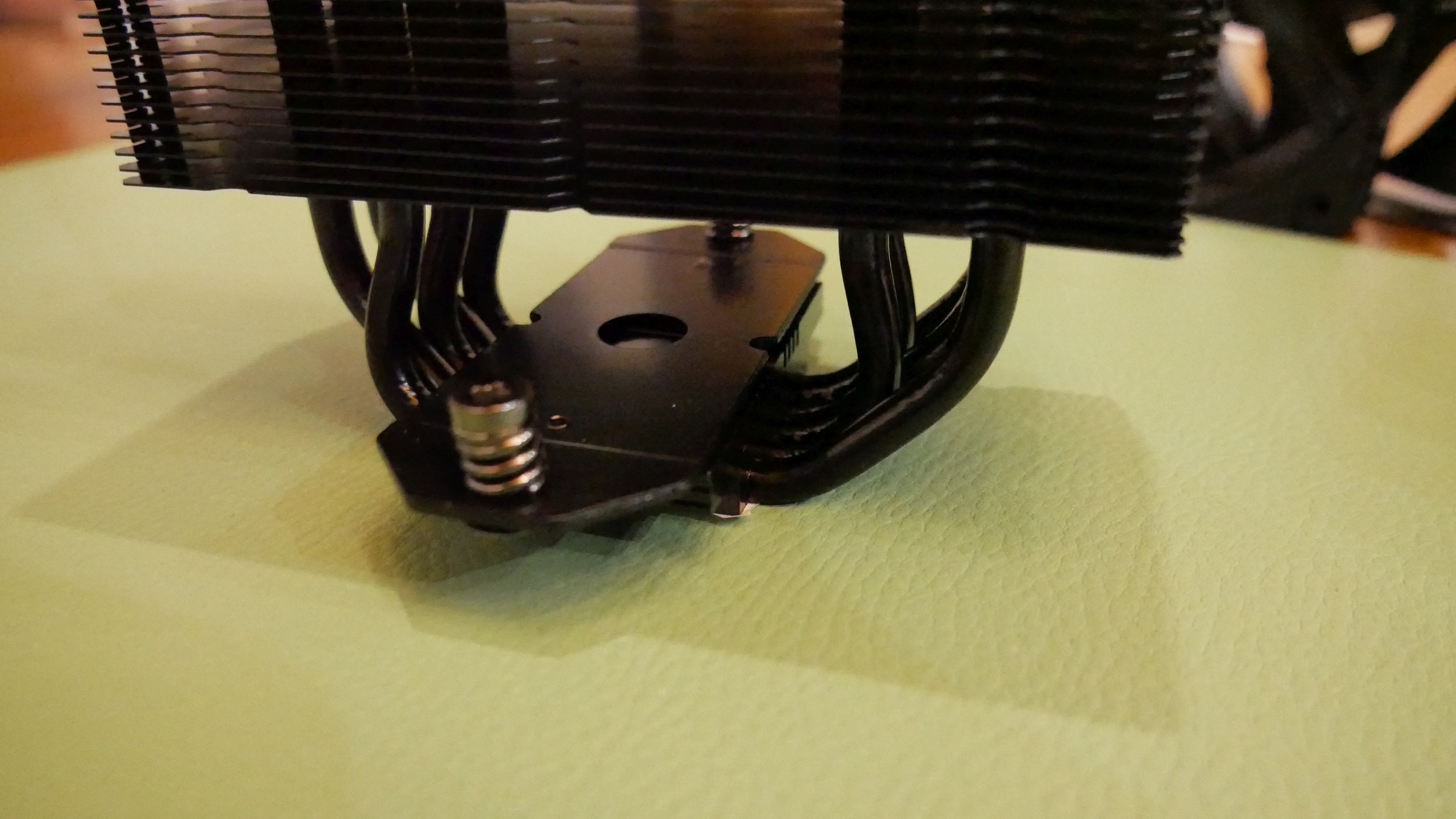 Die Coldplate ist auf eine Höhe mit den Heatpipes beigeschliffen, was den "Direct Touch"-Betrieb ermöglicht. Die Heatpipes liegen also direkt auf dem Heatspreader des Prozessors auf und sollen somit eine direkte und bessere Wärmeabfuhr ermöglichen. Die schwarzen Rillen zwischen den Heatpipes sind nicht mit Material aufgefüllt und verschenken somit vermutlich ein gewisses Kontaktpotenzial. Die Heatpipes sind mattgeschliffen, was ihnen wiederum eine zwar geringere, direkte Auflagefläche, in Verbindung mit der Wärmeleitpaste jedoch eine generell höhere Gesamtoberfläche verleiht.
