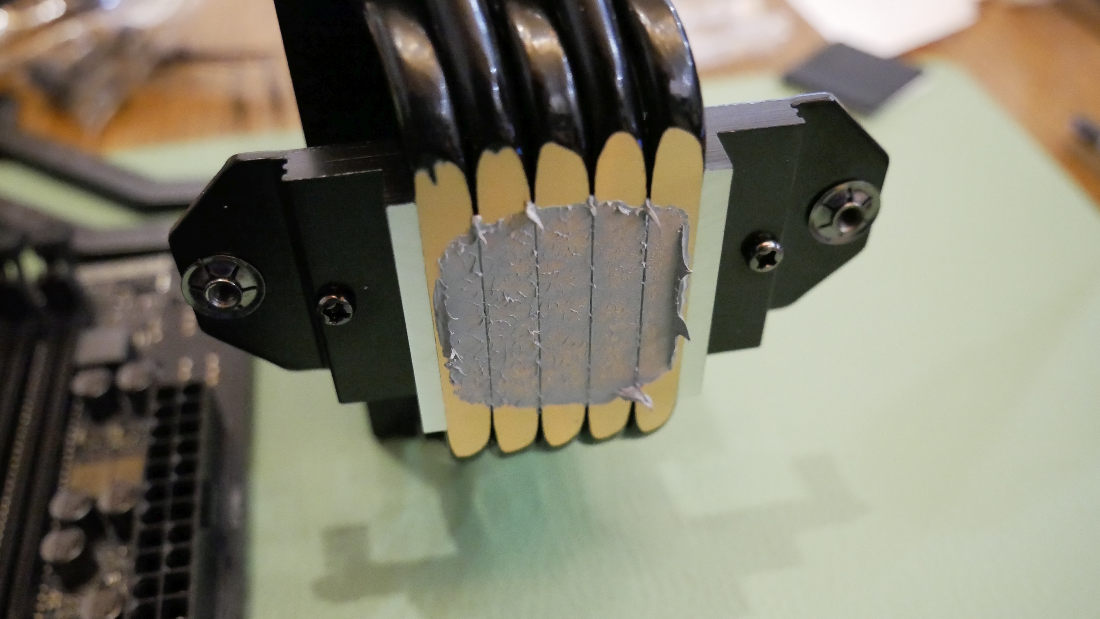 Die Probe auf's Exempel war unnötig: die Wärmeleitpaste hat sich durch das Andrehen des Towers auf dem Mounting Bracket perfekt verteilt. Weder gibt es ausgelassene Ecken, noch Lufteinschlüsse. Dieses praktisch perfekte Bild eines Kontaktschlusses ist auf die zuvor angesprochene, korrekte und durchaus feste Montage der Backpate zurückzuführen. Das trifft nicht nur auf die Montage dieses Kühlers, sondern allgemein auf Backplate-Systeme zu, bei der selbstverständlich niemals mit Gewalt, aber auch keinesfalls zu zimperlich gearbeitet werden darf.