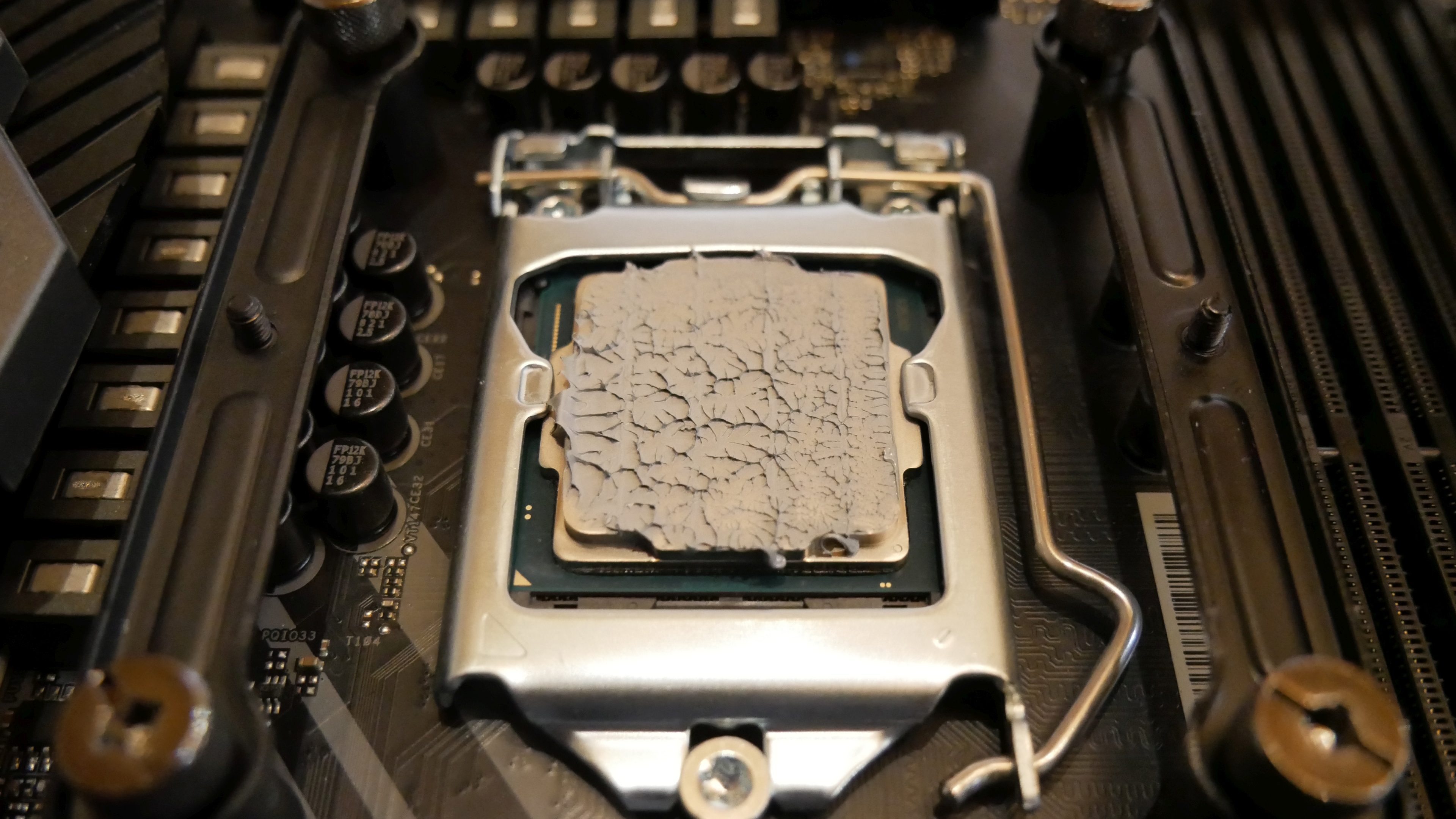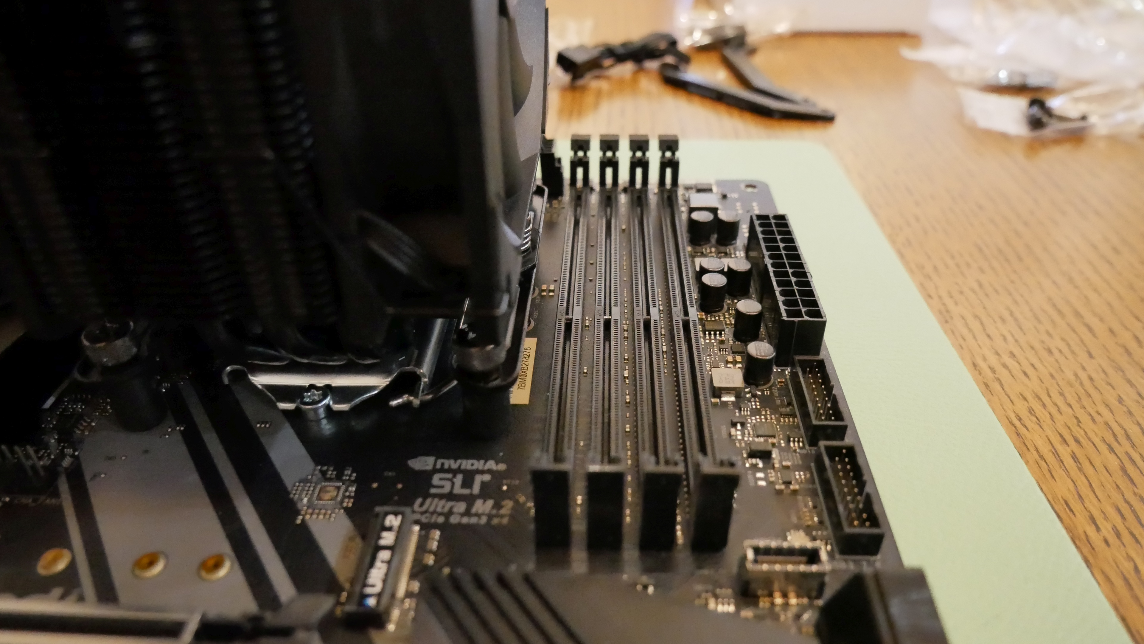 Gemessen am doch recht üppigen "Erbsenklecks" auf der CPU sowie dem in der Tube befindlichen Rest sollte die Wärmeleitpaste für insgesamt drei Anwendungen ausreichend sein. Spätestens danach kauft man sich günstig einen gängigen Platzhirsch in Form der Arctic MX-4 bzw. Arctic MX-6 nach, die es in großen Tuben gibt und mengentechnisch ein Leben lang für den durchschnittlichen Anwender ausreichen sollten. Auf dem zweiten Bild kann man den zuvor angesprochenen Versatz nach links sehr gut erkennen. Auch der Platz zur ersten RAM-Bank ist beachtlich. Da der Kühlkörper nach links hin dennoch nicht über die Montagelöcher des Sockels hinwegragt, sollten selbst massive VRM-Kühler hier keinerlei Kompatibilitätsprobleme verursachen.