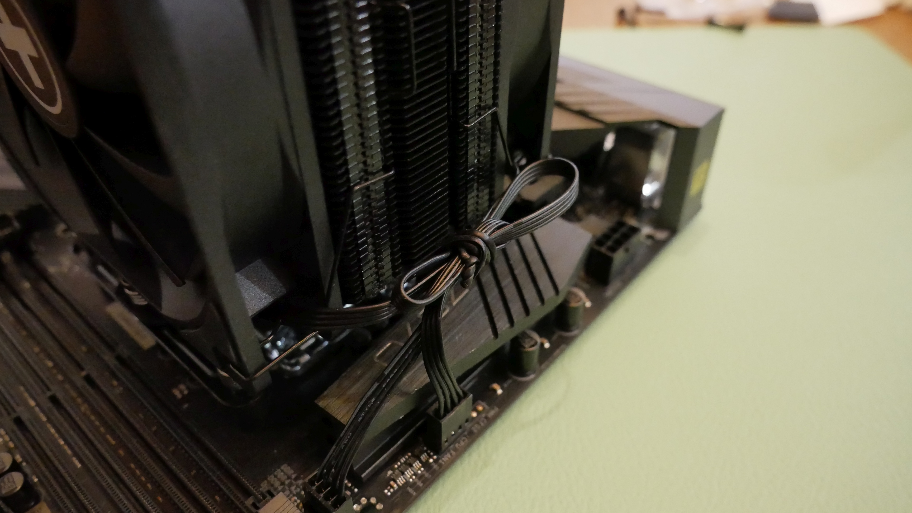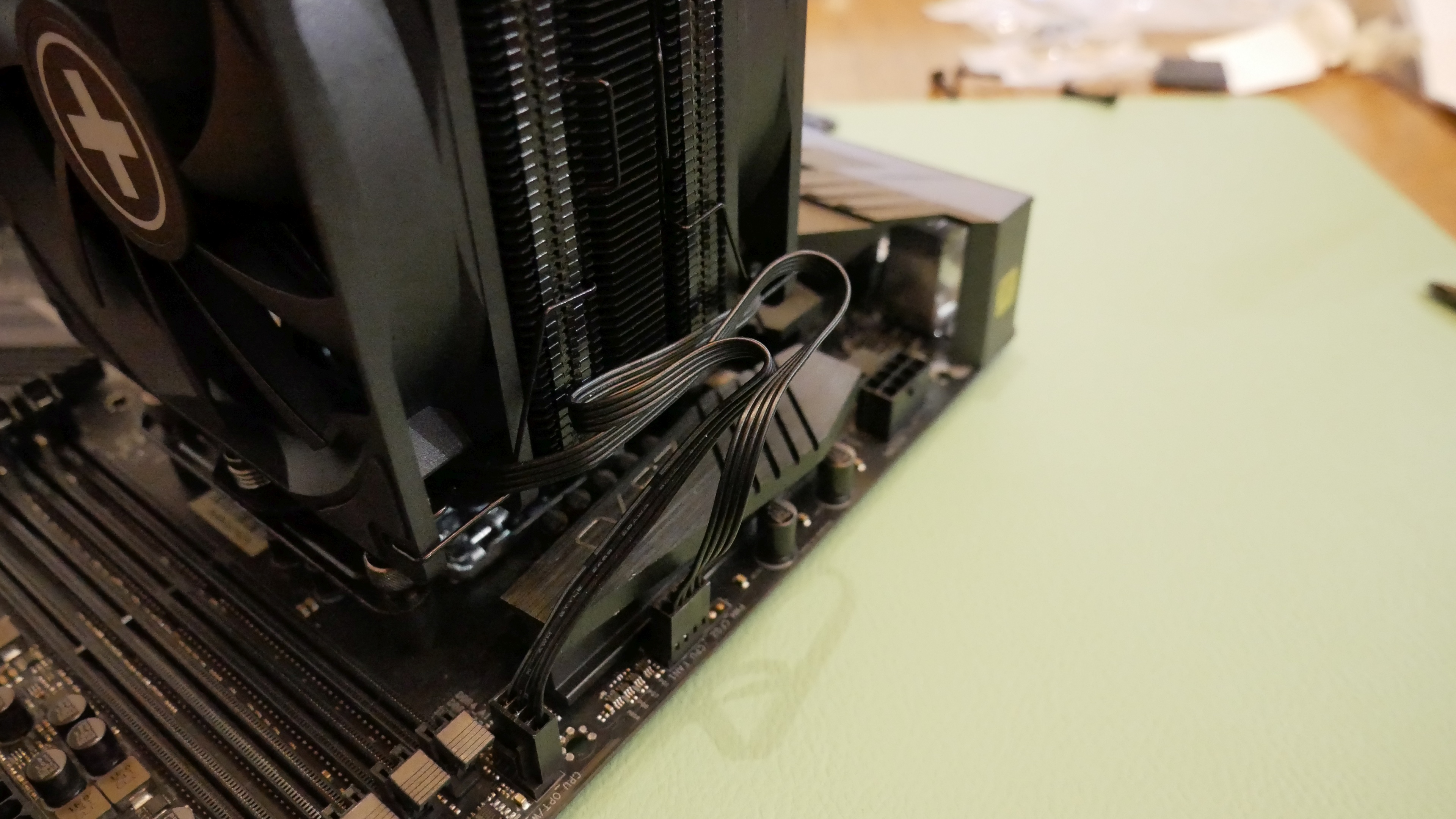 Die Kabel der Lüfter sind ausreichend lang bemessen und können bei Bedarf mit dem beiliegenden Y-Adapter sogar verlängert werden. Die geringe Leistungsaufnahme der beiden Lüfter von lediglich 0,15 Ampere ermöglichen den problemlosen Parallelbetrieb auch an nur einem einzelnen PWM-Header. Das Y-Kabel ist dabei korrekt ausgeführt und holt sich die Drehzahl lediglich von einem der beiden Lüfter. In meinem Fall wurde das Y-Kabel nicht verwendet, da die beiden CPU-Fan-Header des Mainboards (CPUFAN und CPU_WPUMP_OPT) netterweise gut erreichbar nebeneinander und nur unweit vom Kühler platziert sind. Das erleichtert auch das Kabelmanagement. Diese Variante sollte jedoch nur bei absolut gleich arbeitenden Lüftern gewählt werden, damit ein langsamer drehender Lüfter den schnelleren nicht in seiner Arbeit einschränkt. Dies gilt auch für die Lüfterkurven, die für beide Lüfter identisch eingestellt werden müssen. Sollte man sich hier unsicher sein, so ist erneut der Einsatz des beigelegten Y-Kabels vorzuziehen.