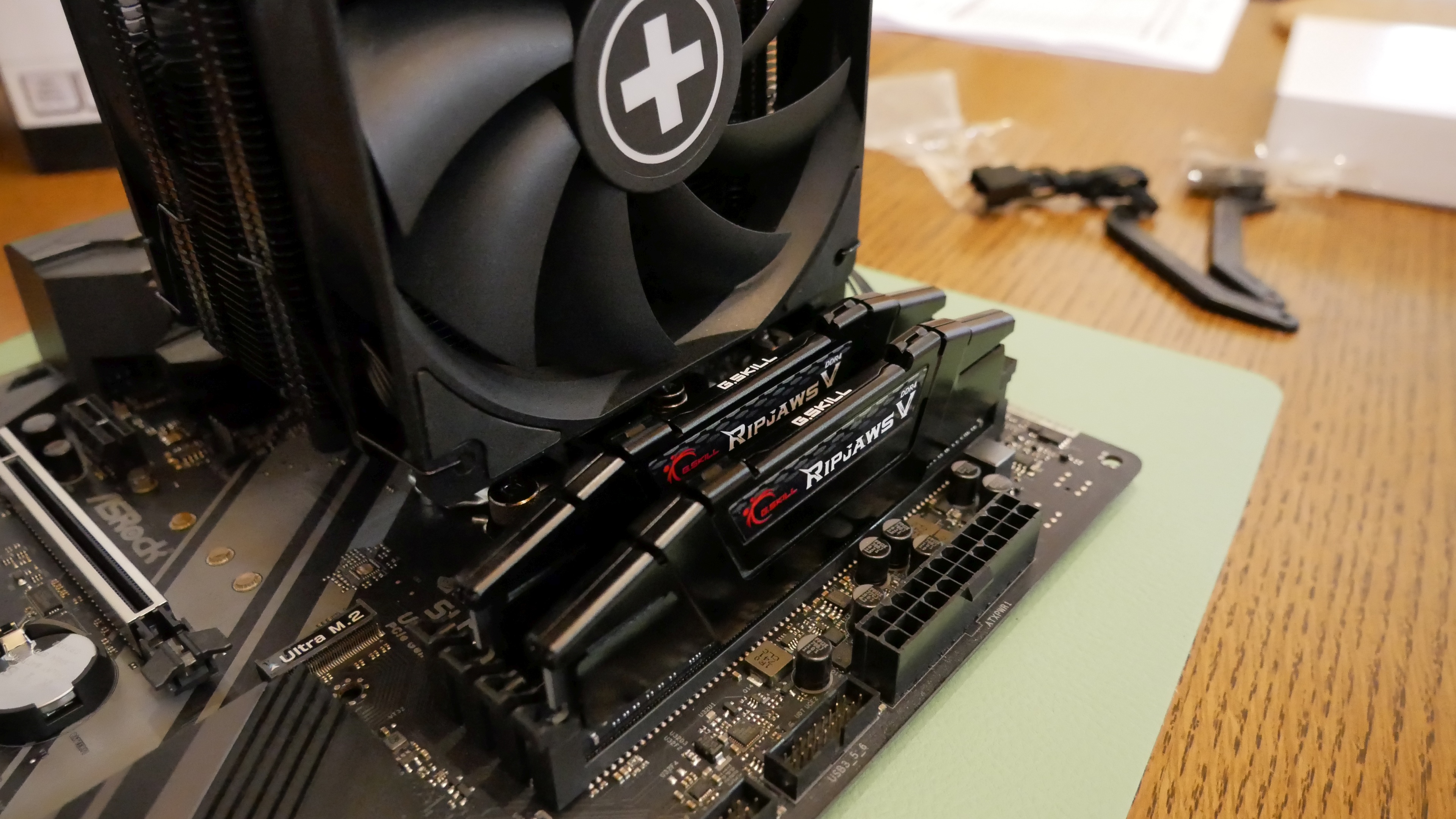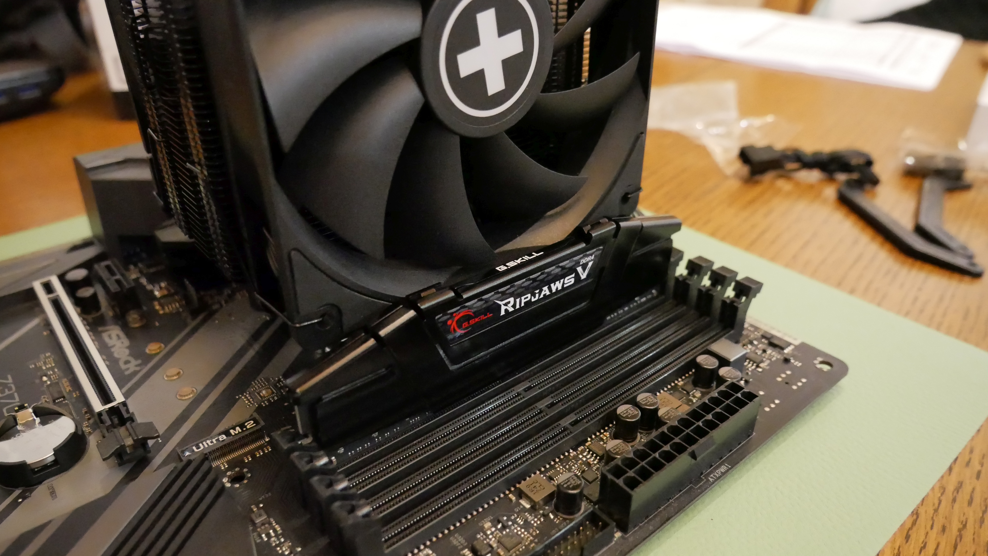 Bevor das Konstrukt im Gehäuse verschwindet, wird noch ein prüfender Blick auf die RAM-Kompatibilität geworfen. Wie zuvor bereits erwähnt, wirkt der nach links versetzte Kühlturm hier Wunder. Die RipJaws V bauen mit 42 Millimetern aufgrund ihrer schwarzen Kühlkörper verhältnismäßig hoch auf. Unter normalen Umständen müsste zumindest bei Vollbestückung der Lüfter weiter nach oben versetzt werden, was wiederum Probleme bei zu schmalen Gehäusen verursachen kann. Dankenderweise hat Xilence an dieser Stelle jedoch mitgedacht und die Bilder bestätigen das.