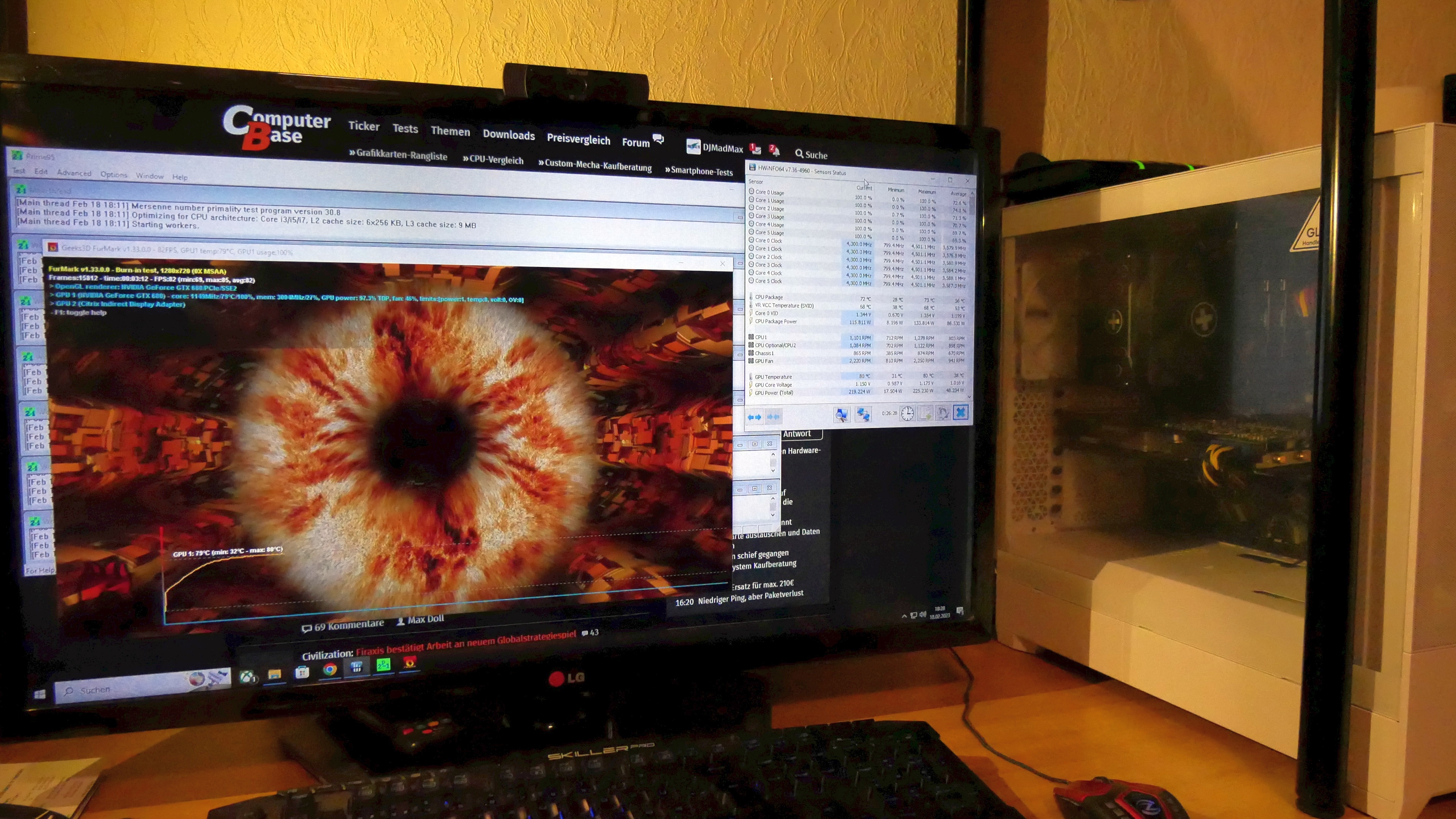 Unter'm Strich verändert sich das Ganze kaum. Die Grafikkarte pendelt sich bei 81°C ein, wo sie aufgrund ihrer altbackenen Lüfterkonstruktion mit eher kleinen Lüfterblättern durchaus hörbar wird. Die Lüfter der Grafikkarte steigen schrittweise auf ca. 2.500 u/min an, wo sie deutlich hörbar werden.