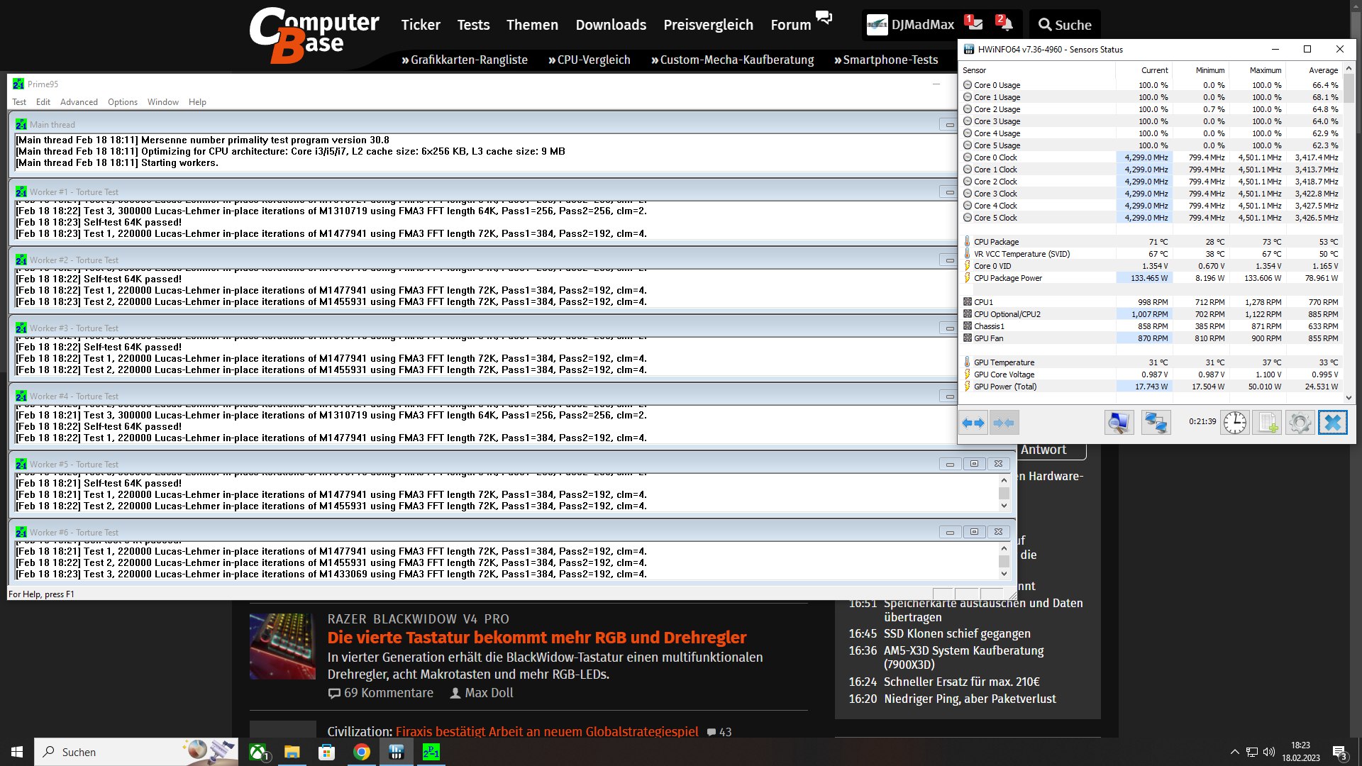 Der HWiNFO-Screenshot zeigt den Idle-Betrieb, während im Browser ein Twitch-Stream läuft und ein wenig im Netz gesurft wurde.