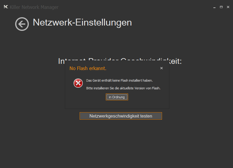Der Bandbreitentest, der meiner Kenntnis nach auch benötigt wird, um die erweiterten Einstellungen zu nutzen, streikt. Angeblich habe ich kein flash installiert, was ich auf adobe flash beziehe, was aber natürlich schon installiert ist (inkl. Neuinstallation). Wireless Killer N trouble.png Auch die Software zur Bedienung selbst habe ich mehrmals installiert.