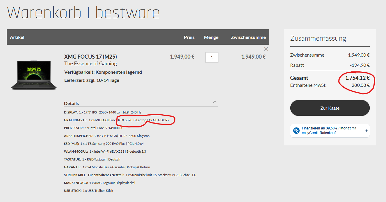 "130 Euro lassen sich also gegenüber dem XMG Focus 17 (M25) durch den Wechsel der CPU von Intel auf AMD, aber vor allem den Wechsel von RTX 5070 Ti Laptop GPU 12 GB auf GeForce RTX 5060 Laptop GPU 8 GB einsparen."