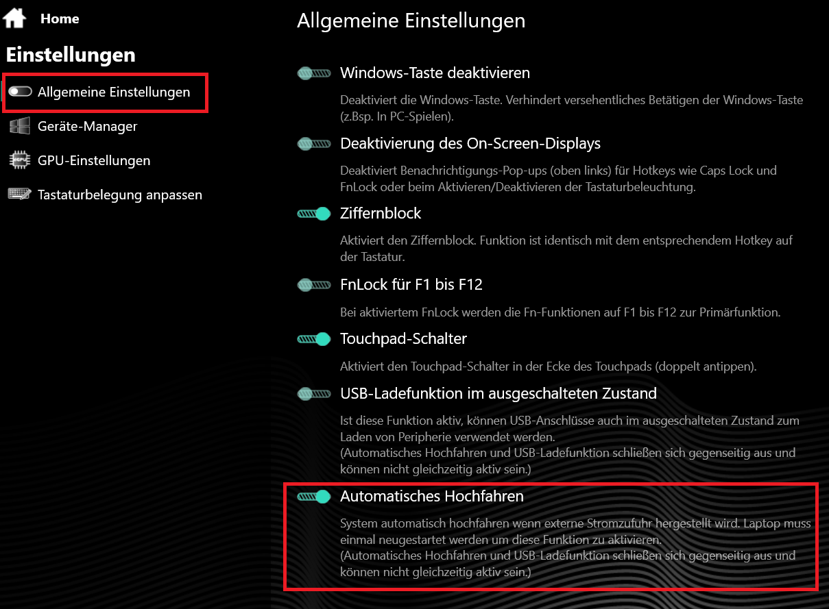 Ich habe Probleme mit der Funktion "Automatisches Hochfahren" unter Allgemeine Einstellungen im CC. Ich habe es eingeschaltet und fahre das Notebook herunter. Dann ziehe ich den Netzstecker des Netzteils und wums fährt das Notebook nach ca. 10s plötzlich im Akkumodus wieder hoch! Ich habe es mehrmals getestet und immer das gleiche! Mit meinem vorherigen Modell das XMG NEO 15 E21 hatte es immer geklappt. Hat jemand auch die Probleme? Den Support habe ich bereits angeschrieben!