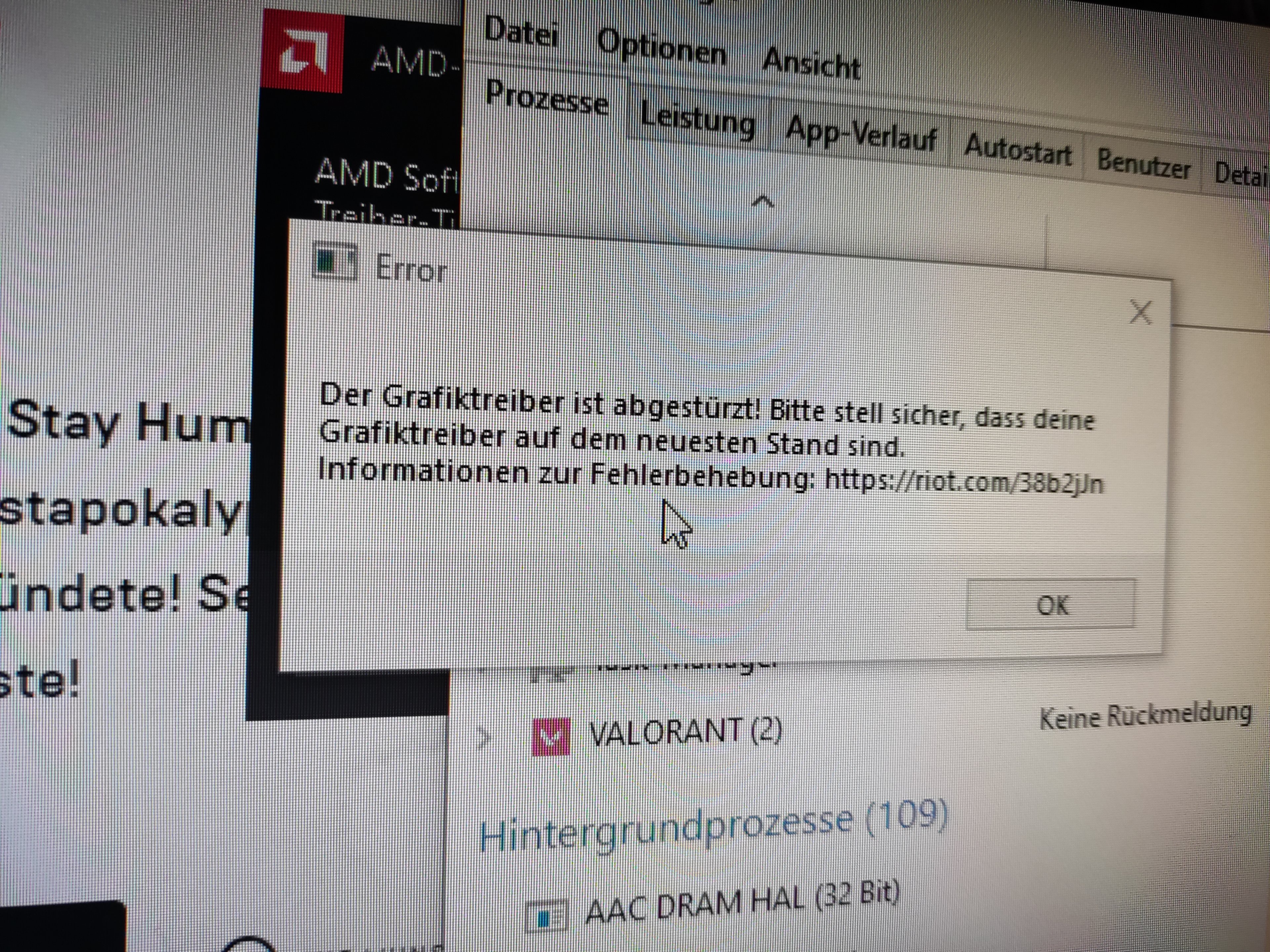 Ich habe meinem Bruder am 22.01.2022 einen neuen PC zusammengebaut und nun hat er mir berichtet, dass der PC bei Spielen abstürzt (Bei Valorant meist sofort und bei Fortnite ~stündlich). Nun habe ich den PC zu mir genommen und meine XFX RX570 eingebaut in der Annahme, dass es an der Grafikkarte liegt, allerdings kommt es trotzdem zu abstürzen (nur mit Valorant getestet), teilweise ohne Fehlermeldung und teilweise mit, siehe Anhänge.