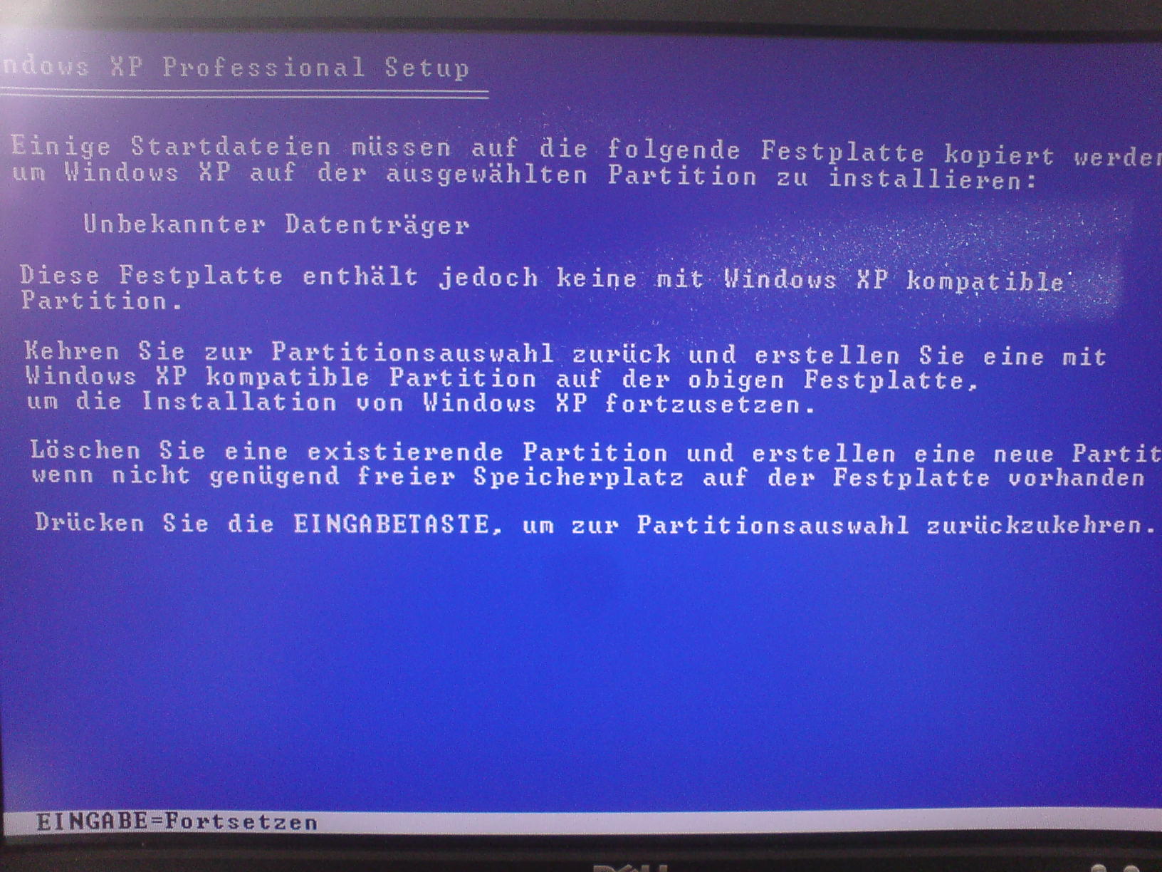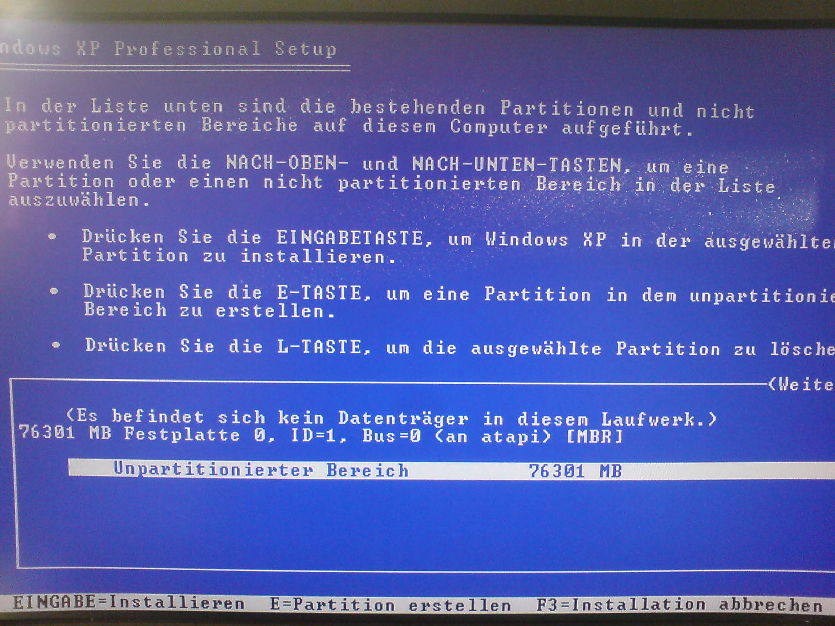 Dann wenn der Screen mit der Festplatte kommt (Partition festlegen, löschen etc.) lässt sich die Partition nicht festlegen. Löschen mit der L-Taste geht auch nicht.