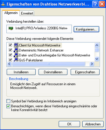 Mir fällt einfach nichts mehr ein. Eine leise Vermutung liegt noch im Bereich "Eigenschaften von Drahtlose Netzwerkverbindungen" (siehe angehängtes Bild). Es wäre möglich, dass ich vor langer Zeit dort etwas verändert habe. Bringt es vielleicht was, die aufgelisteten Elemente (z.B. Client für Microsoft Netzwerke, ...) zu deinstallieren und neu zu installieren? Oder evtl. die Treiber und Anwendungssoftware (Intel ProSet) für die WLAN-Karte komplett neu zu installieren?