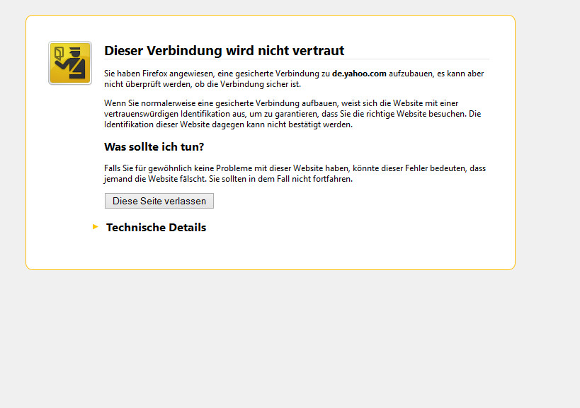 Hallo, seit heute habe ich mit Yahoo.de Probleme. Wenn ich die Seite abrufe, kommt die Meldung "Dieser Verbindung wird nicht vertraut" siehe bitte Anhang.