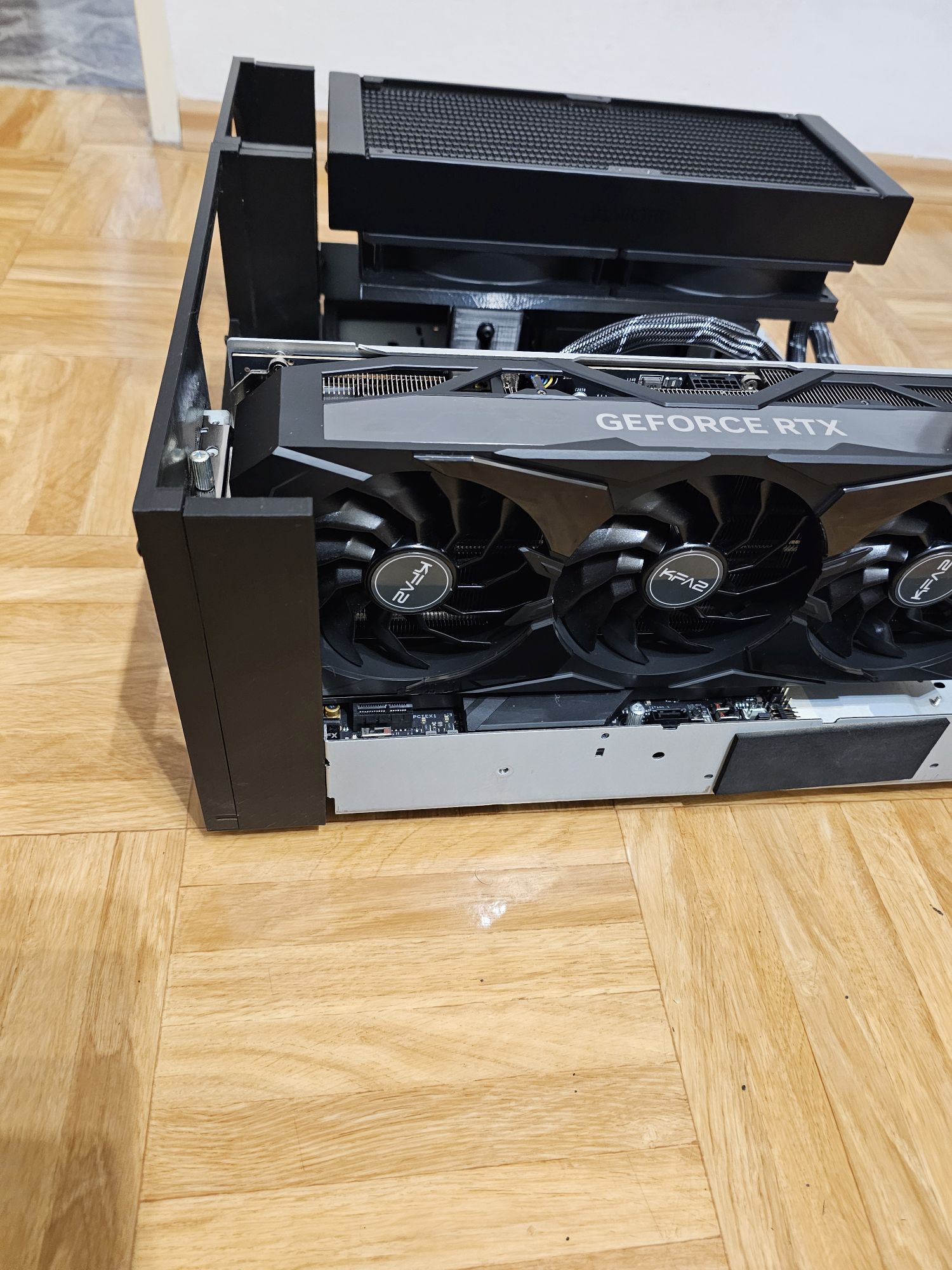 Ich kürze das hier jetzt mal was ab. Zuerst mal die Abstandshalter für das Mainboard gesetzt. Das Gehäuse wurde um 3,5 cm nach Hinten verlängert. Mit Ausparungen für 2x 80mm Lüfter und 1x 120 mm Lüfter. Die Verlängerung wurde auch 1 cm höher gedruckt, da die Grafikkarte zu hoch ist. Also muss später alles noch hochgesetzt werden. Leider habe ich vergessen, das ja noch das Stromkabel an die Graka kommt. Deshalb wird es wohl alles noch etwas höher werden. Zuerst mal einen 90 Grad Stromadapter für die Graka bestellt. Kommt am Donnerstag. Hab bei Cablemod ein 90 Grad 12vhpwr bestellt. Das dauert aber weil Anfertigung. Netzteil hat Typ 5 micro Anschlüsse.
