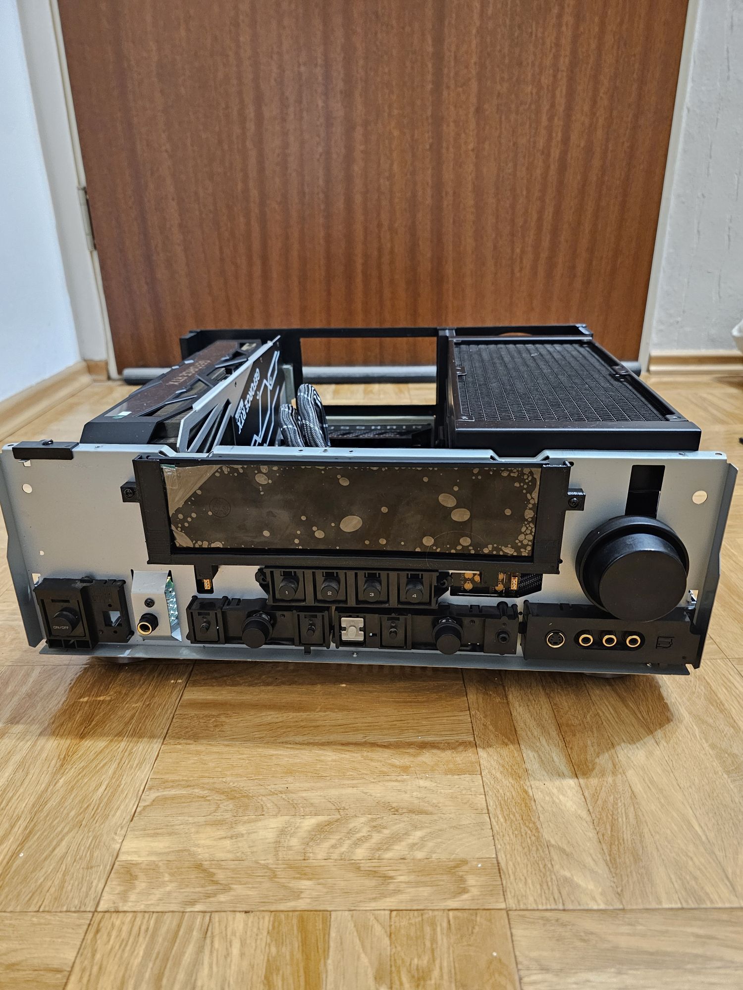 Da ich in meiner Wohnung keinen Platz habe, für Tisch, Monitor, Stuhl etc. war von Anfang an klar, das der PC ins Wohnzimmer kommt. Der wird an den Sony A84J angeschlossen. Nich nur zum Spielen, sondern auch für CAD Anwendungen die ich für die 3D Drucker benötige. Wollte keine PC oder HTPC Gehäuse ins Wohnzimmer stellen. Der Yamaha hatte vor 2 Jahren einen Wasserschaden und stand seitdem im Keller.