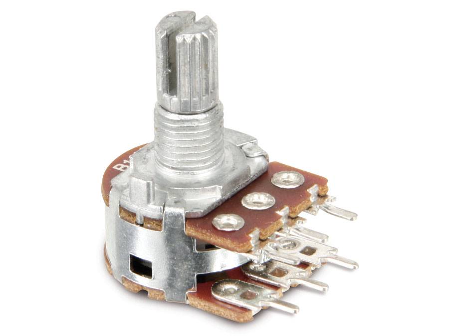 Verbaut sind 4 Potis, diese sind für den Stereobetrieb ausgelegt und haben 3 Schleiferbahnen und 6 Pins in einer Reihe des Lochrasters.
