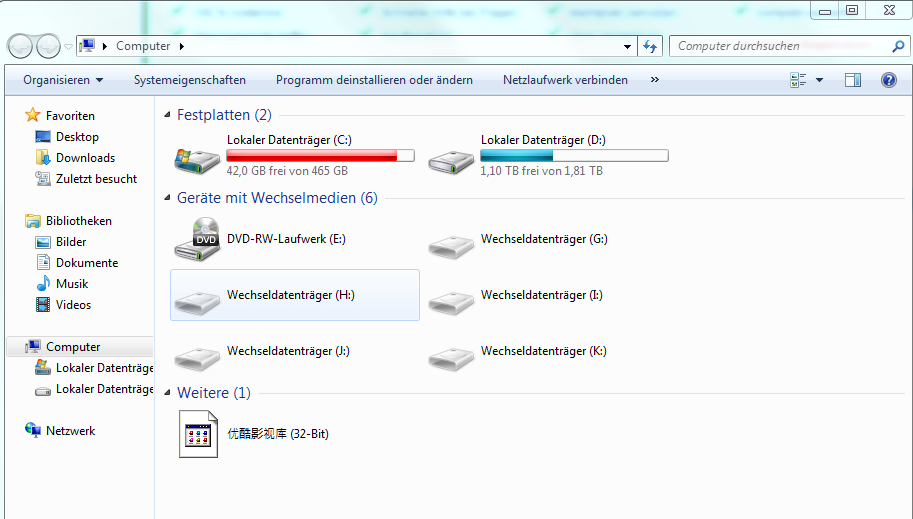 habe mittlerweile alles deinstalliert, abgesehen von "Youku", eine software die nicht nur als standard video player eingestellt wurde, sondern auch zum downloaden von videos auf der chinesischen videoplattform "Youku" genutzt wird, jetzt habe ich schon alles mögliche versucht, das wieder zu entfernen, es wird mir aber immernoch unter Computer angezeigt, auch wenn es nicht mehr funktioniert. hab es schon mit mehreren Uninstallern versucht, aber nichts funktioniert.