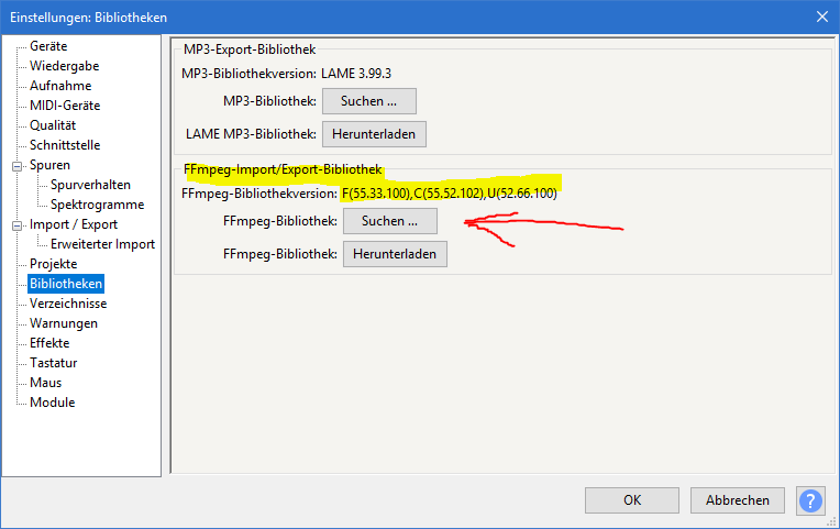 Ansonsten kannst du bei Audacity auch manuell auf die benötigte Bibliothek verweisen, indem du unter Einstellungen-> Bibliotheken gehst, und dort dann unter FFmpeg Bibliothek auf Suchen klickst, falls die Bibliothek nicht gefunden wurde. (bei der Dateiauswahl muss dann auf avformat-55.dll verwiesen werden.)