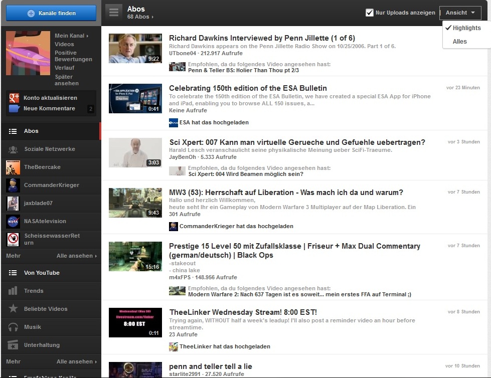 Ich habe ein Problem mit Firefox in Kombination mit YouTube. Und zwar werden mir die Empfehlungen, die YouTube für den Nutzer angibt in meiner Abobox angezeigt. Eine sehr nervige Sache, denn ich möchte wirklich nur die Videos in meiner Abobox stehen haben, die von den mir abonnierten Kanälen hochgeladen wurden. Auf meinem Netbook funktioniert das Design ohne Probleme. Da sich die Einstellungen zwischen Netbookbrowser (Ebenfalls Firefox) und Towerbrowser nicht unterscheiden, wende ich mich mit meinem Problem an euch.