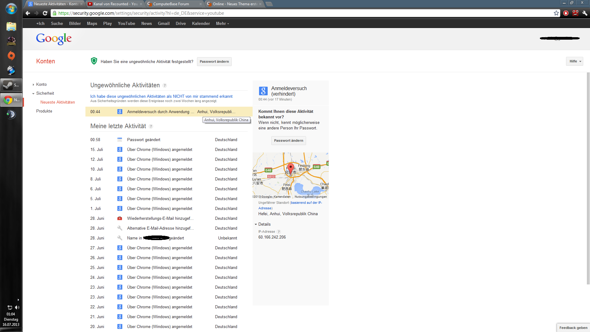 Soeben ich mir auf der YouTube Startseite aufgefallen, dass scheinbar sich jemand (00:44) auf meinen YouTube-Account eingeloggt hat, ich mach nachgeguckt und scheinbar ist dieser Nutzer von CHINA ??