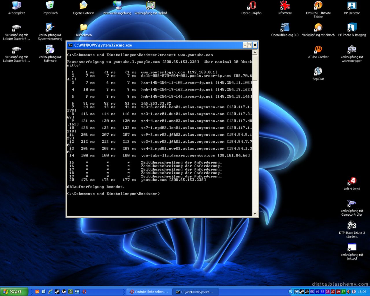 Hab folgendes.Seit ein paar Tagen hab ich erhebliche Schwierigkeiten Youtube zu erreichen.Egal wie ich die Seite aufrufe(per Link,über Google,Lesezeichen oder direkte Eingabe in die Adresszeile).Ganz selten,dass ich mal ohne Probleme auf die Seite komme.Wenn ich dann mal drauf bin gehts dann ohne Probleme.Ich benutze Opera.Aber auch mit FF3 und IE7 dasselbe.Liegt das jetzt nur an der Seite,oder kann das Problem auch woanders liegen?