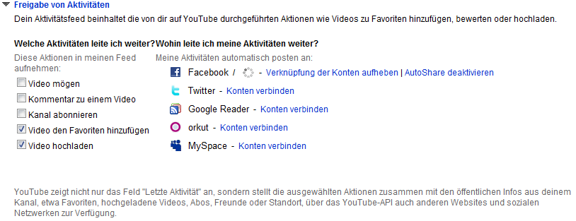 So weit so gut, ich habe in Youtube unter Konto und Freigabe von Aktivitäten mein Facebook-Konto angegeben und habe bei Feeds aufnehmen "Video hochladen" und "Video den Favoriten hinzufügen" angekreuzt.
