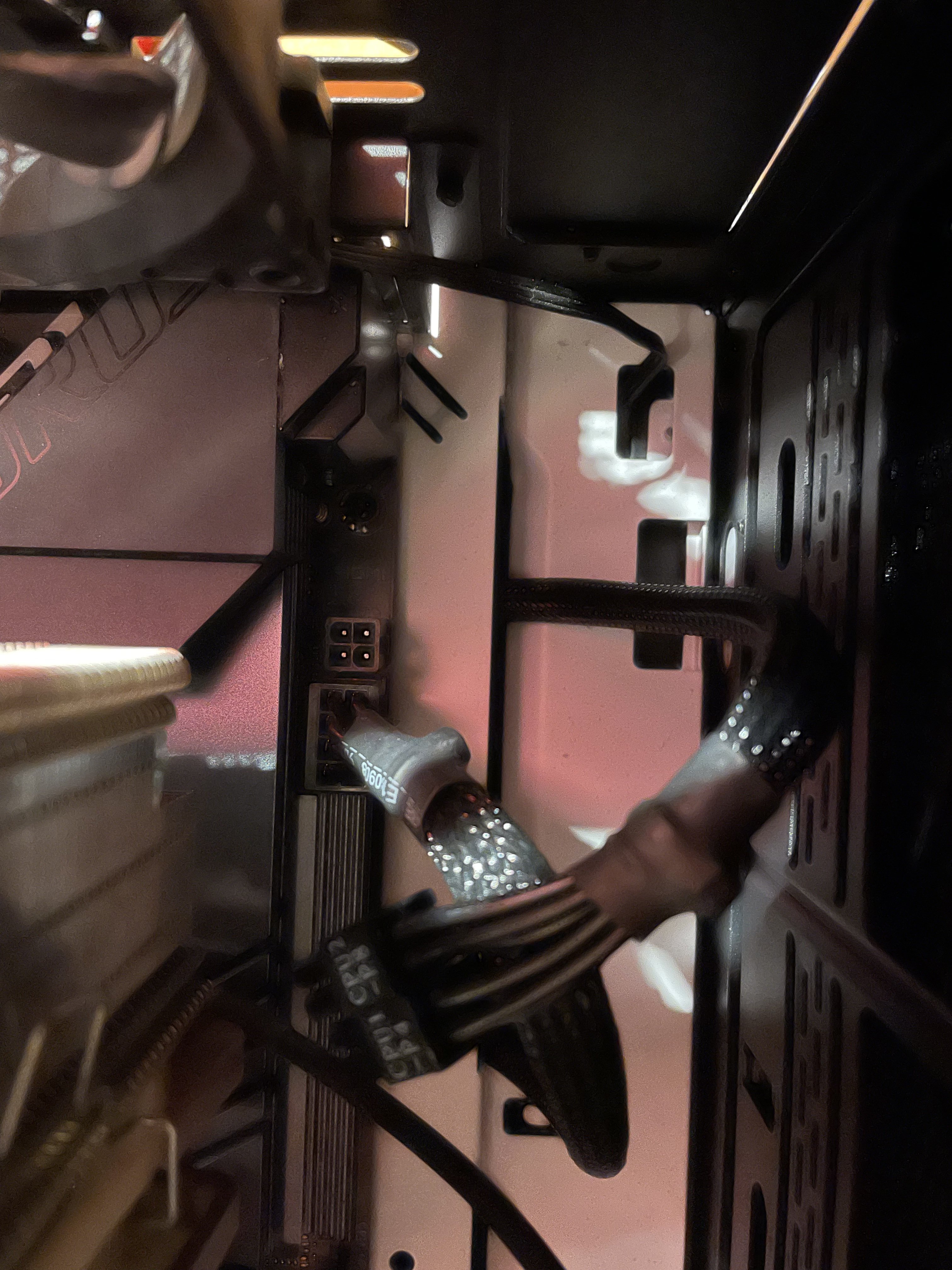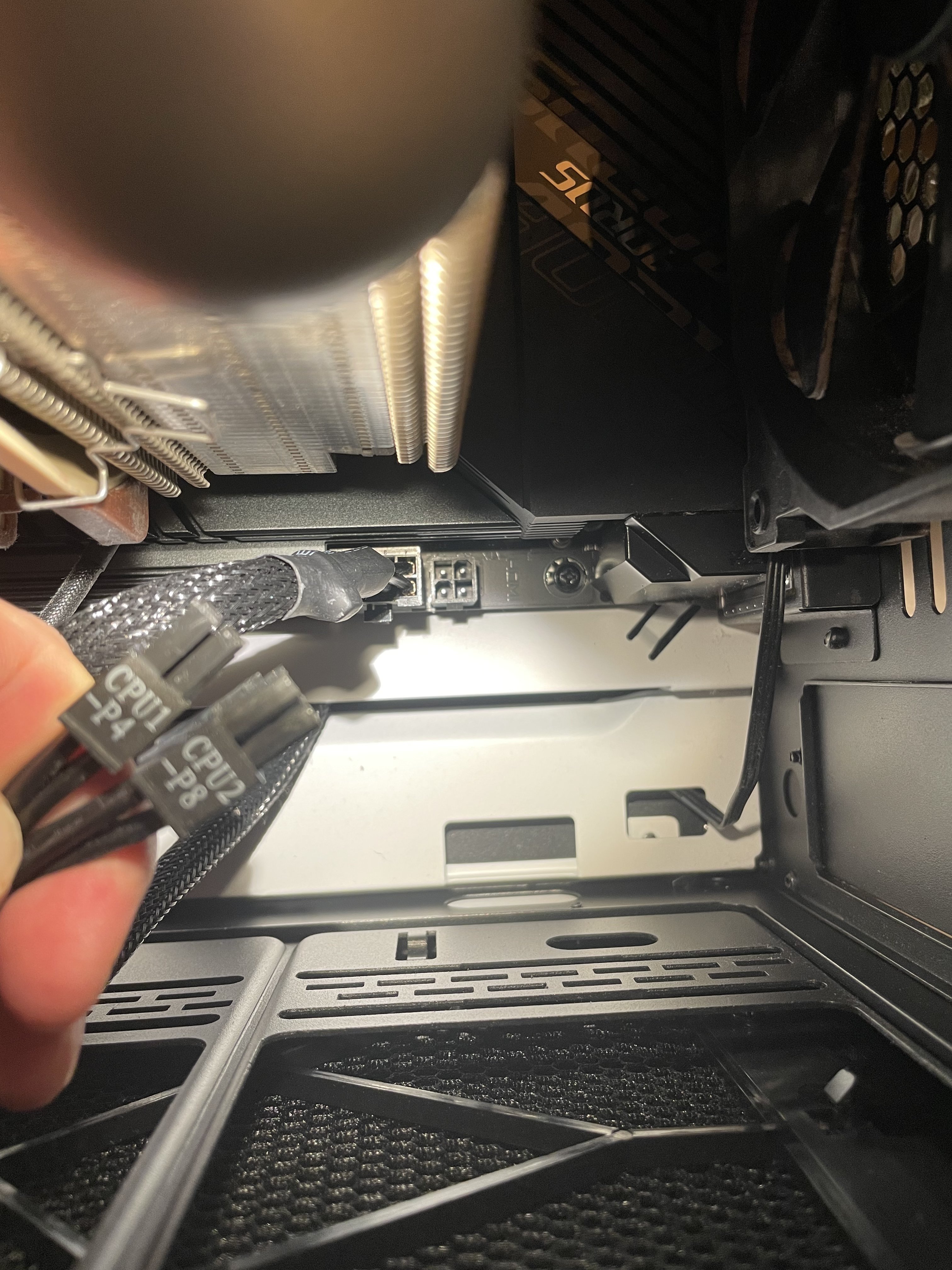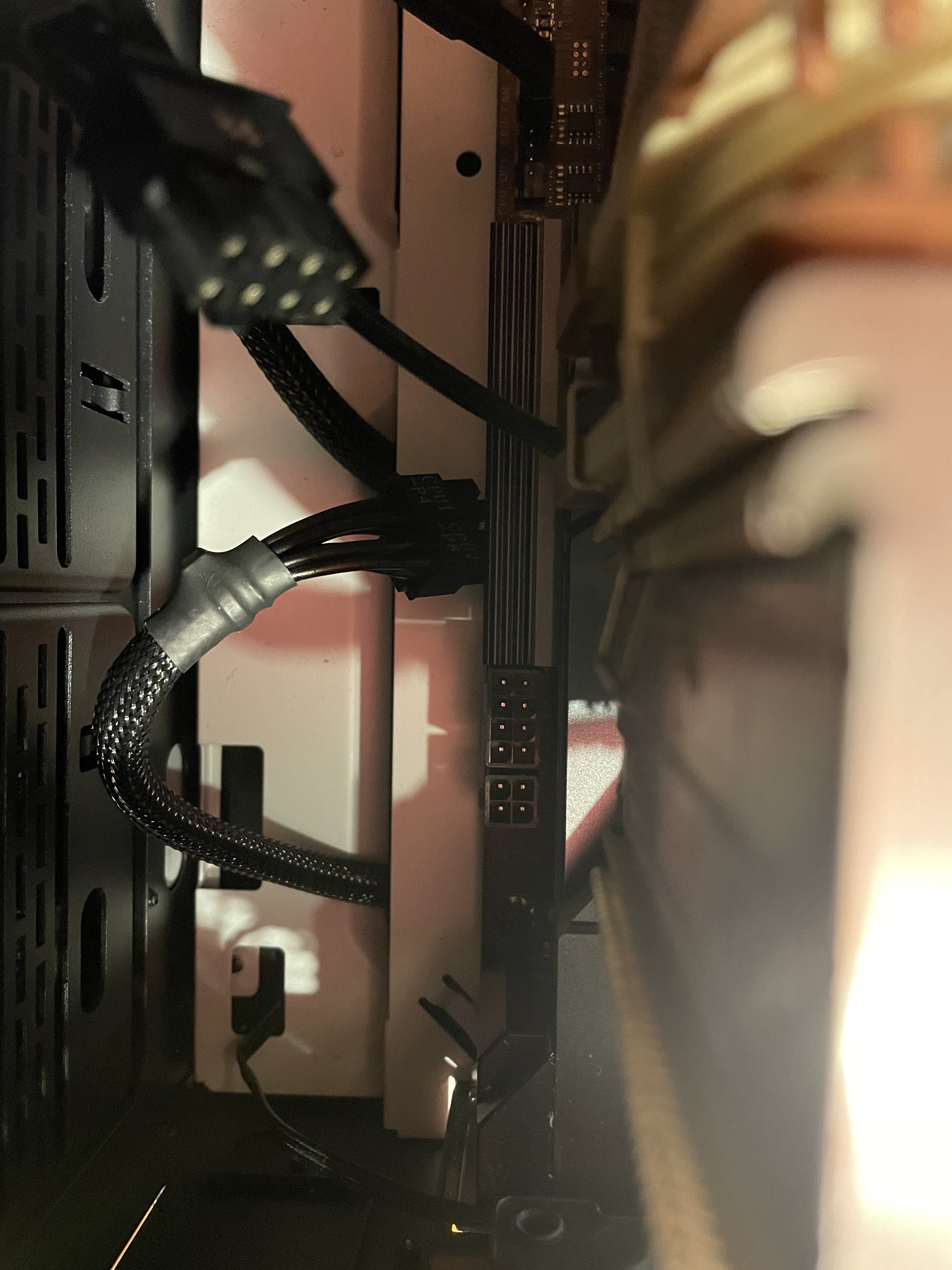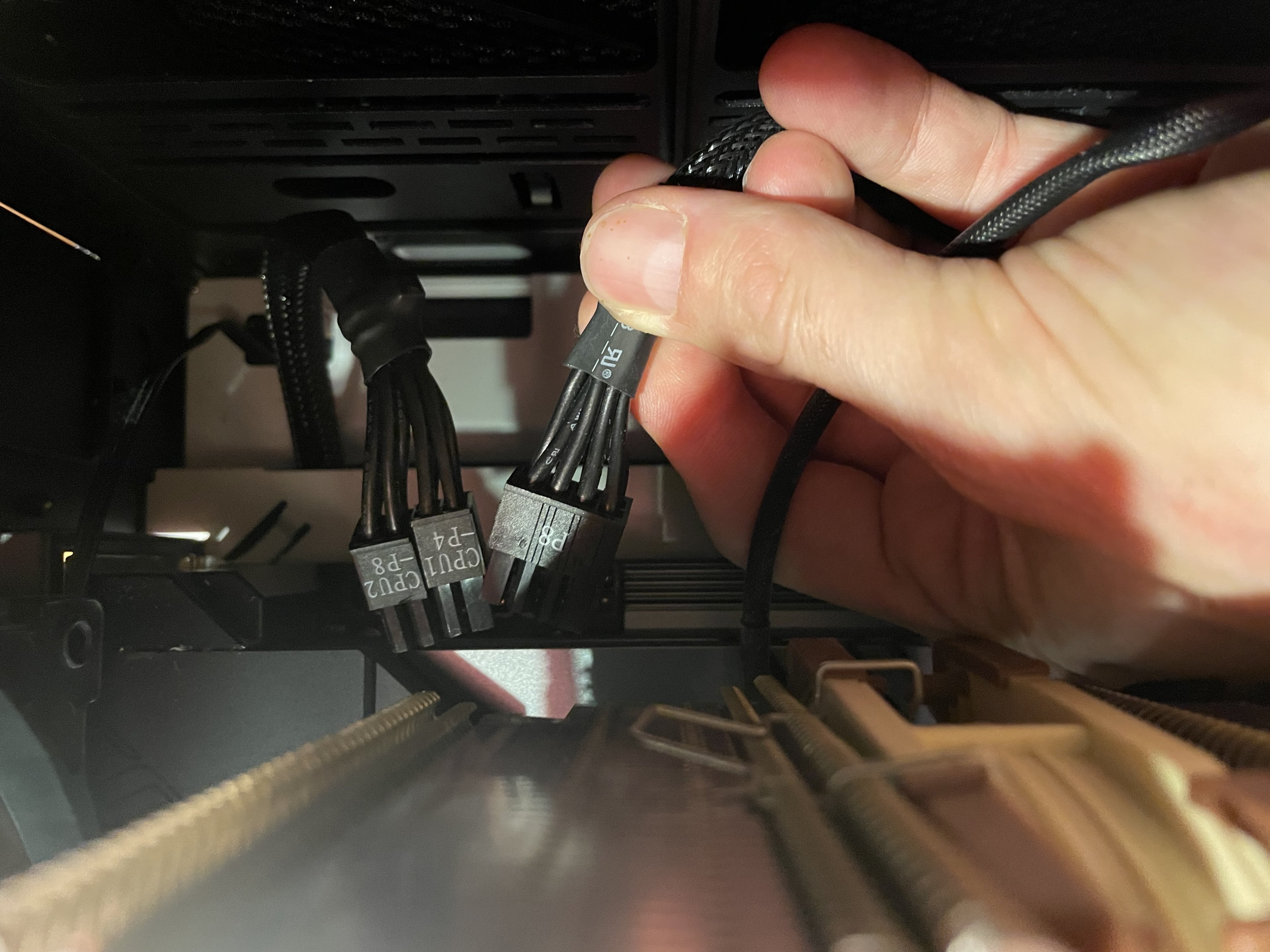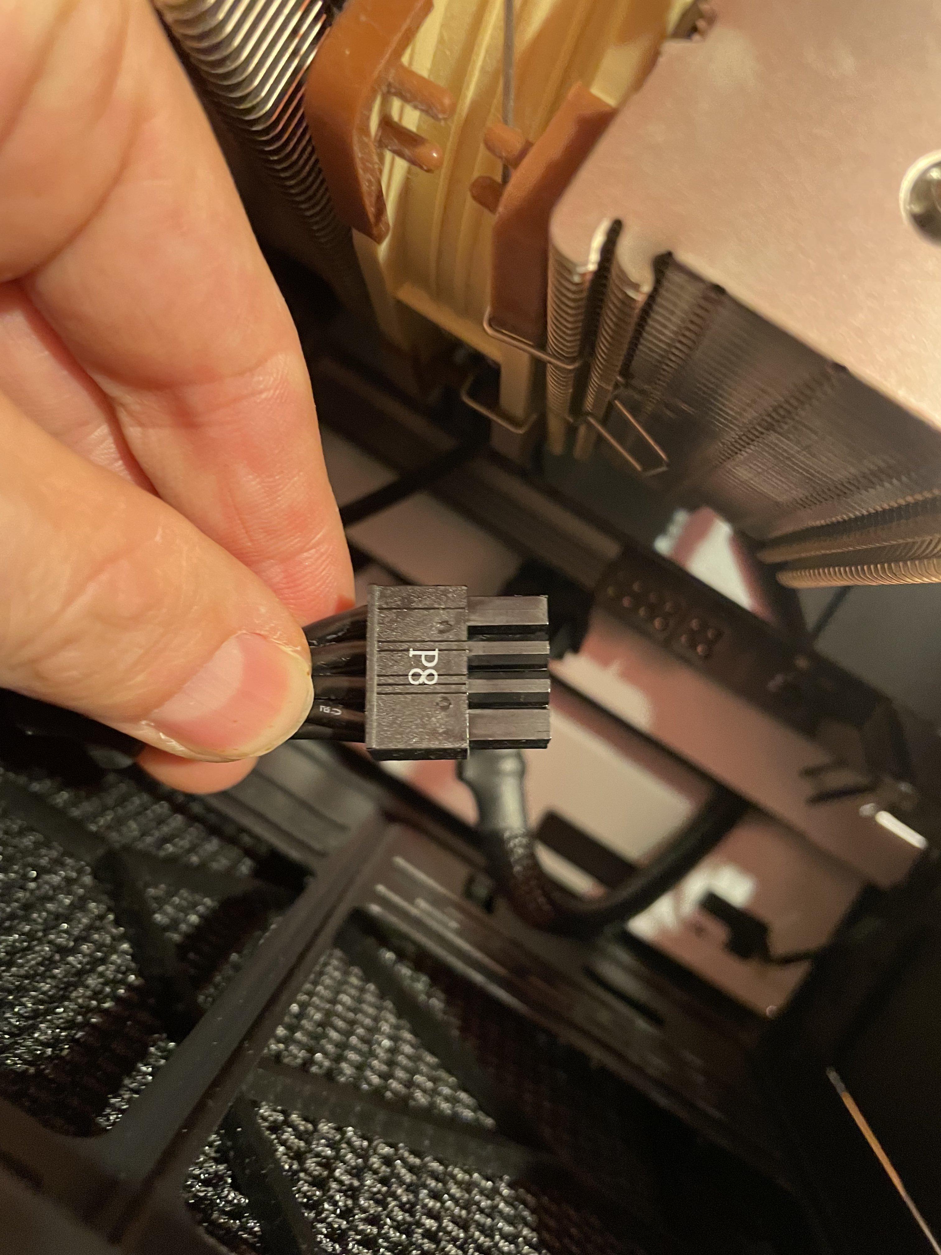 Die Beiden Kabel die du da in die Kamera hältst sind normal zusammen ein 8 Pin Stromanschluss. Welcher steckt in der 8 Pin Buchse im Mainboard? Wie ist der Beschriftet?