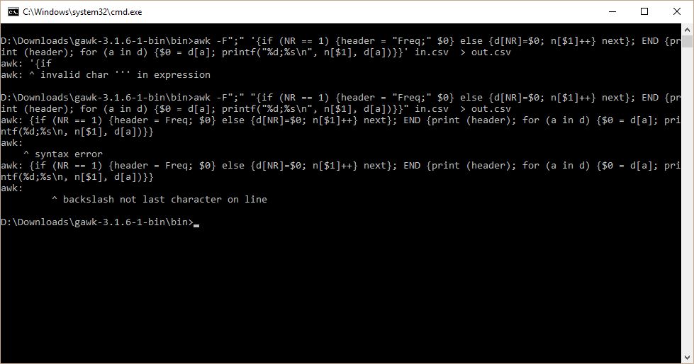 Es fängt damit an, dass das erste ' (Hochkomma) bemäkelt wird und dann fängt sich der Interpreter nicht mehr ein. Ich kompiliere mir awk selber, allerdings nicht statisch, so dass ich es nicht hochladen kann. Ich empfehle, es mit gawk aus dieser Distribution zu versuchen.