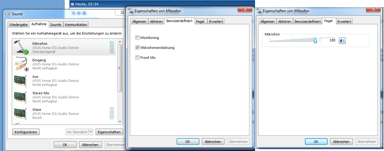 verklinkt ist das ganze an ner xonar dg und der mikrofon verstaerker ist in der xonar software eingeschaltet, kann aber unter windows zb nicht die db des verstaerkers einstellen.