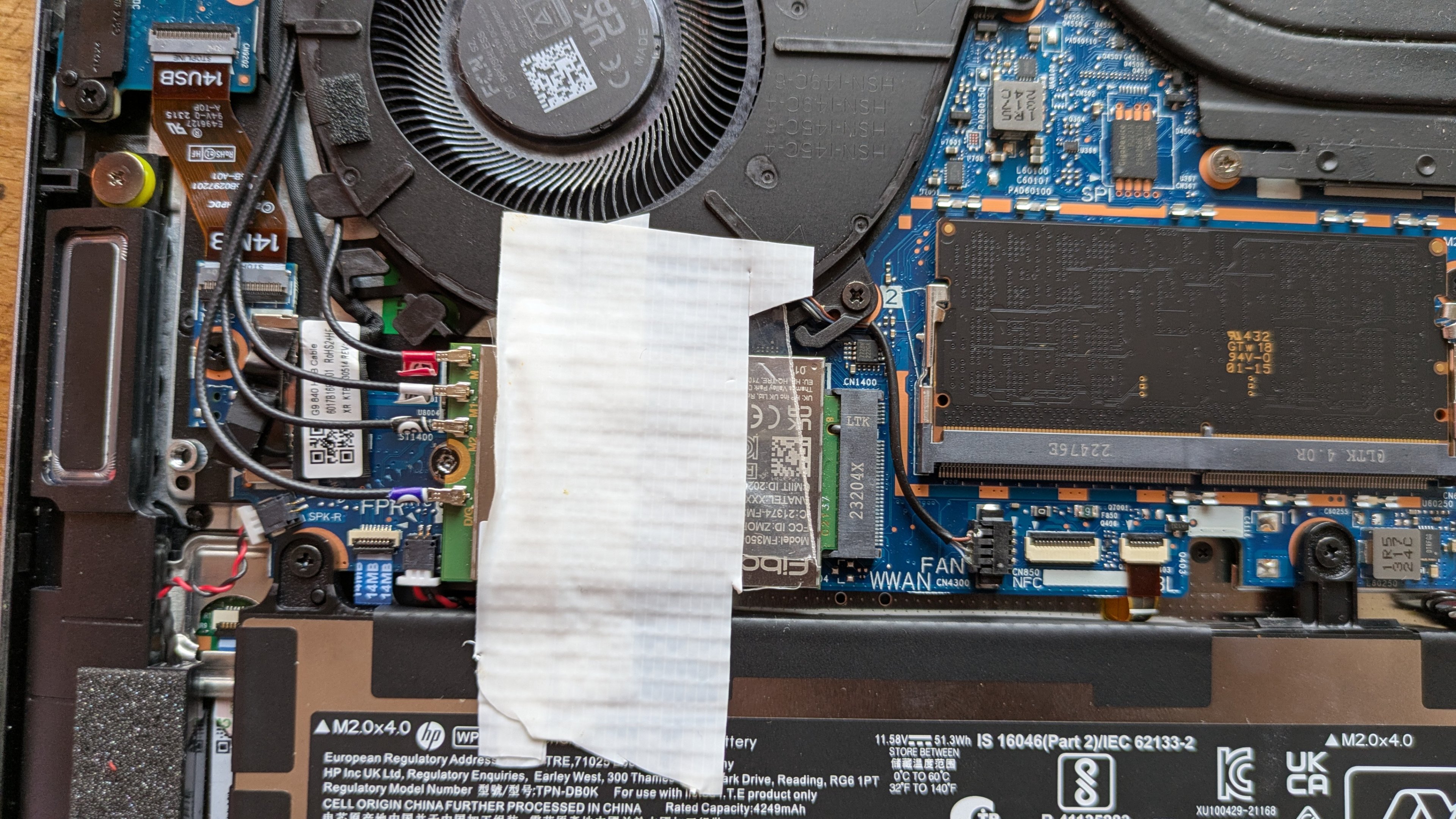 Durch Zufall stellte ich fest, dass ein SIM-Karten-Slot verbaut ist, ging dem auf den Grund und fand einen freien 2242er Steckplatz mit vier in Plastikkäppchen verpackten Antennenenden. Weil das WLAN im Studentenwohnheim ungefähr so gut ist wie LTE zu Zeiten von E-Plus (ok das ist hart), entschied ich mich ein Modul zu kaufen. Der Laptop wartete ja förmlich auf eines. Ein Originales HP Intel 5G Solution 5000 für stolze 240€. Modul geliefert, jetzt noch schnell einbauen. Da kann ja nichts schief gehen, oh wait...