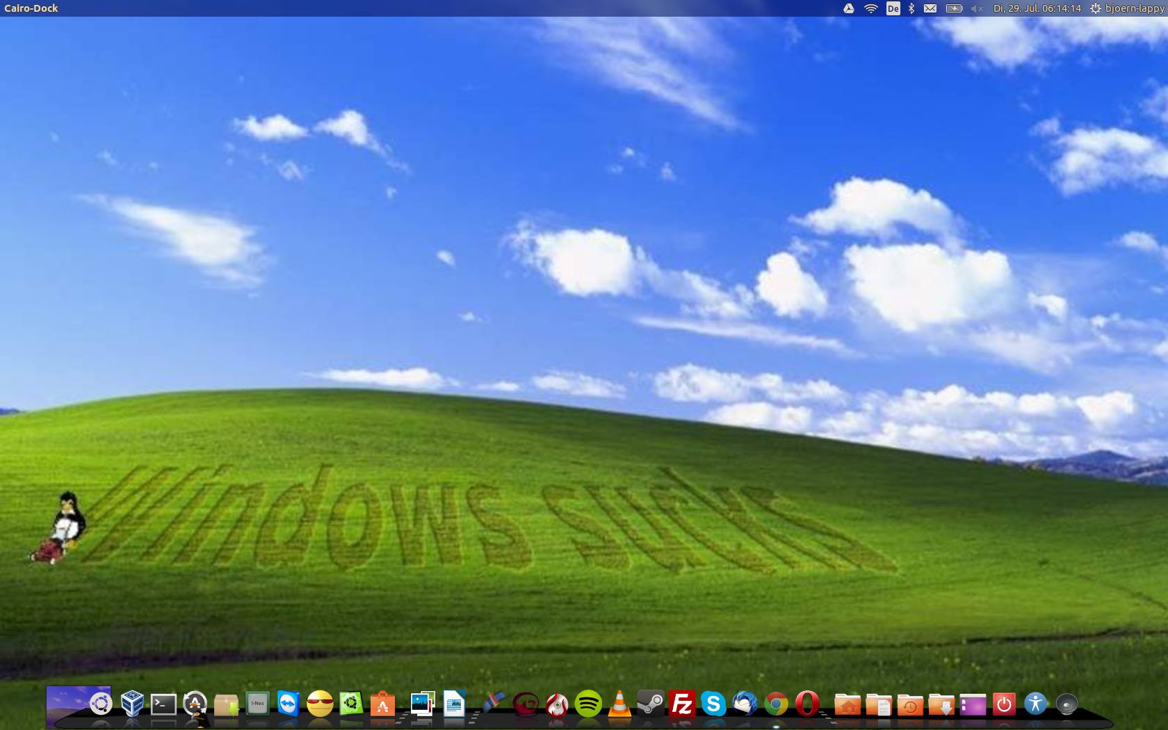ziemlich Standard, hatte mal Widgets hier und da, aber hab eh immer Firefox im Vordergrund. Taskleiste muss unten sein, weil oben entsprechend die FF Tabs sind. Center Dock mag ich auch nicht, Menü unten links ist einfach muscle memory.