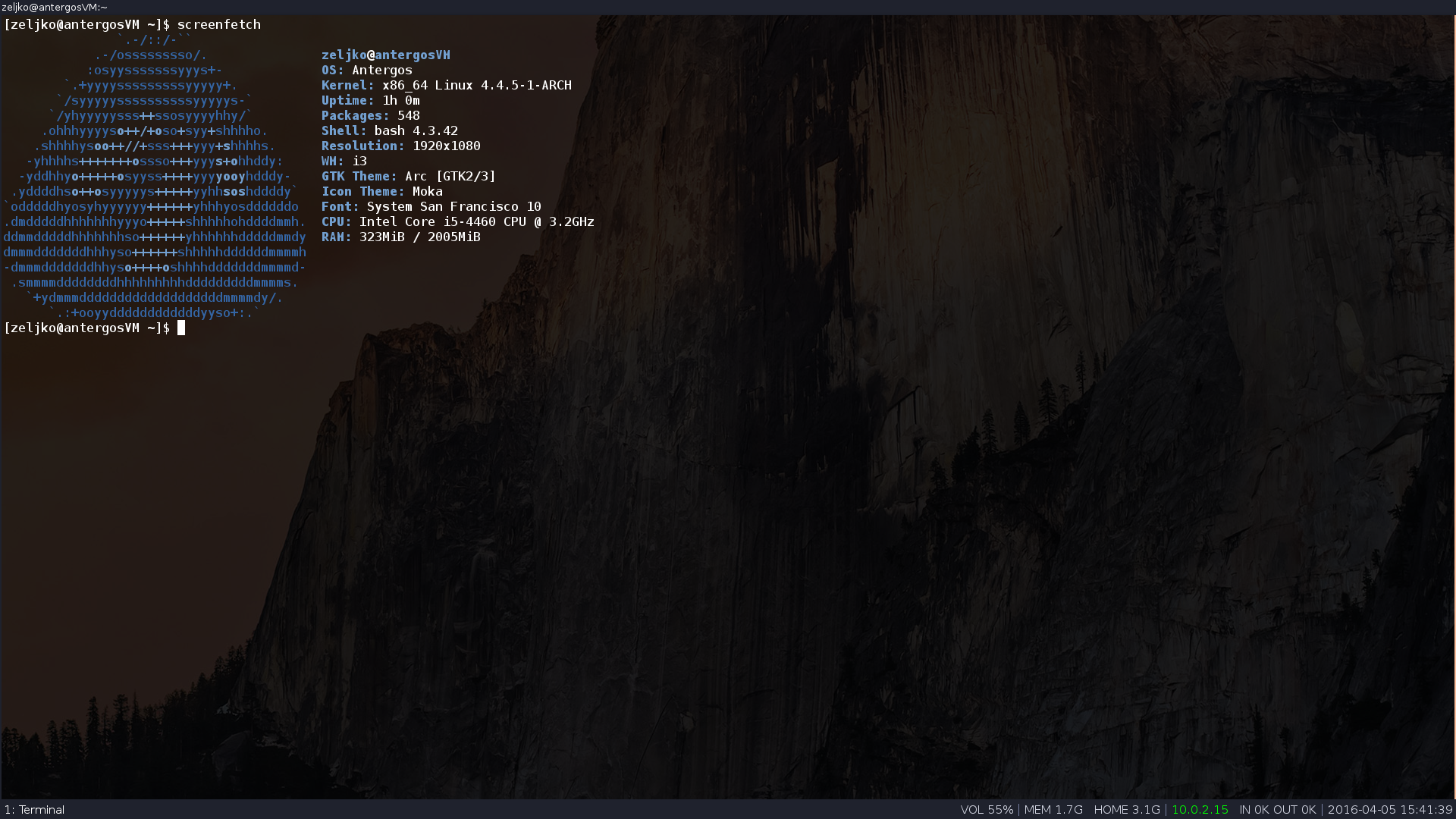 Um es mir einfacher zu machen Antergos Base installiert in der VM installiert und dann losgelegt , denn ich habe es geschafft in einer VM i3 so unbenuztbar zu machen ,dass es paar Minuten gebraucht hat das Terminal zu oeffnen. Ich weiss auch nicht warum und wie. Jetzt beim 2. Versuch ging es sauber.