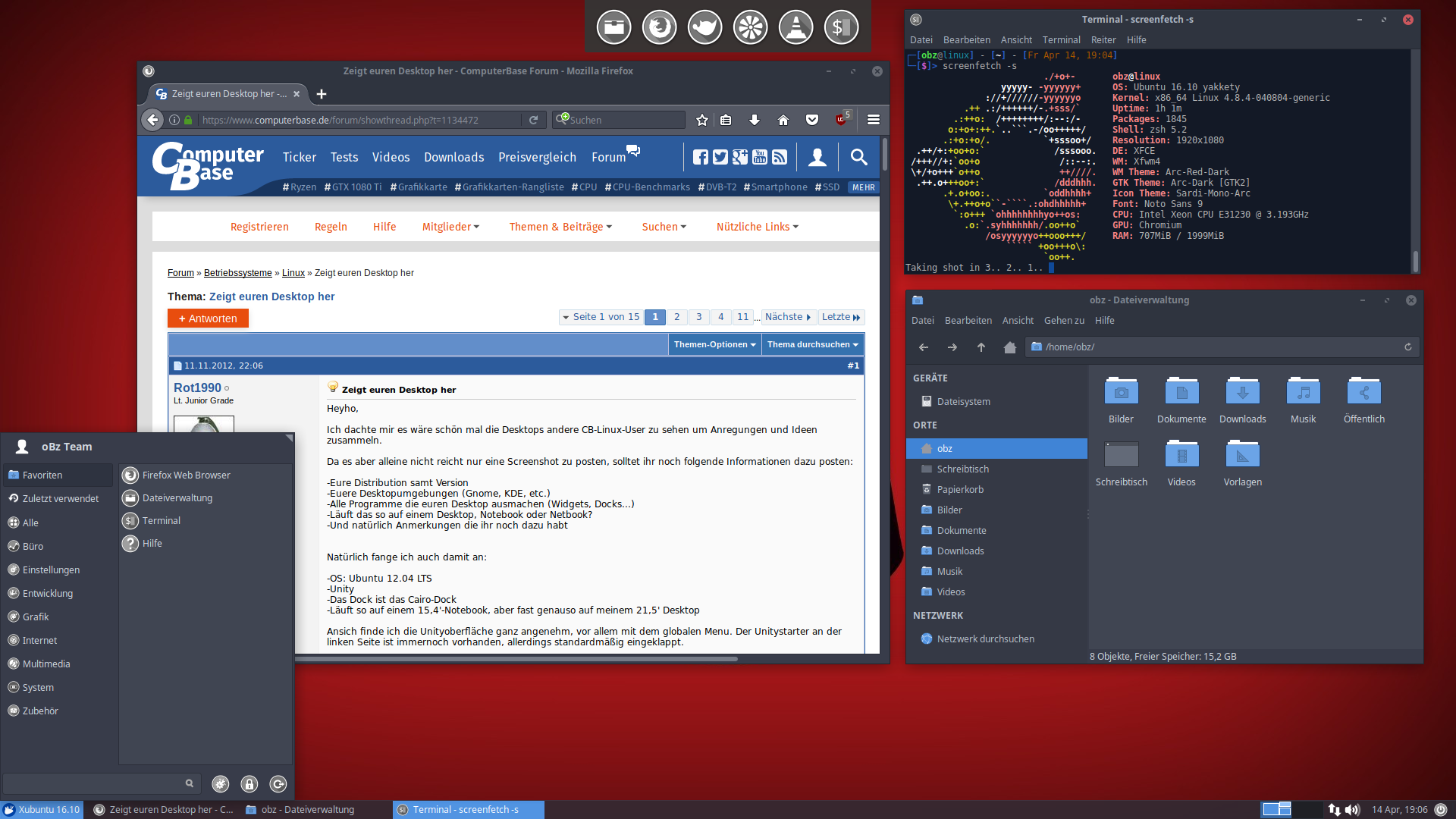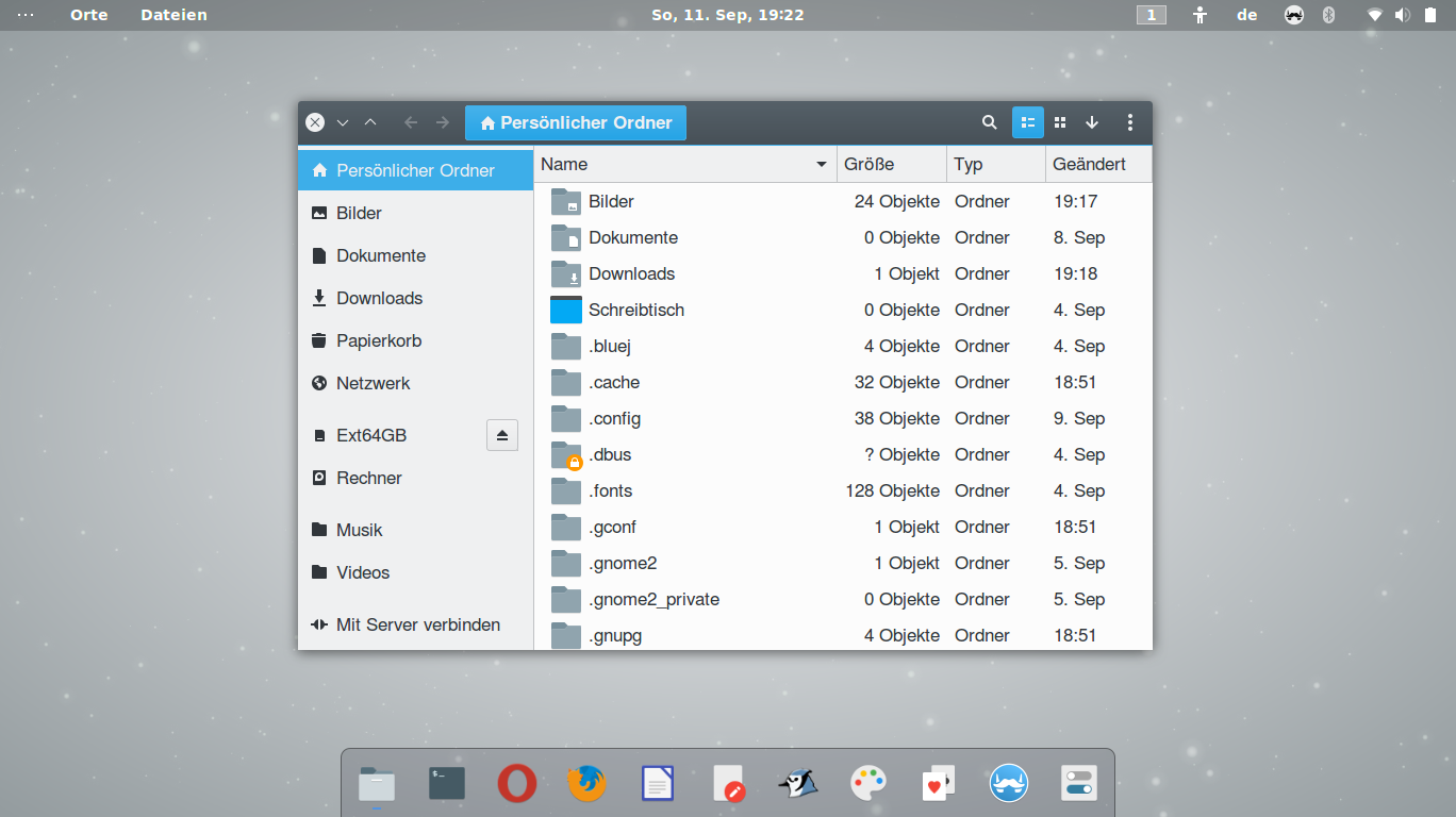 Installiert ist Gnome Shell mit dem Shell-Thema Arc, dem GTK-Thema Breeze und dem Symbolthema Paper. Darüber hinaus kommen verschiedene Shell-Extensions zum Einsatz, u.a. für das transparente Panel und das Dock.