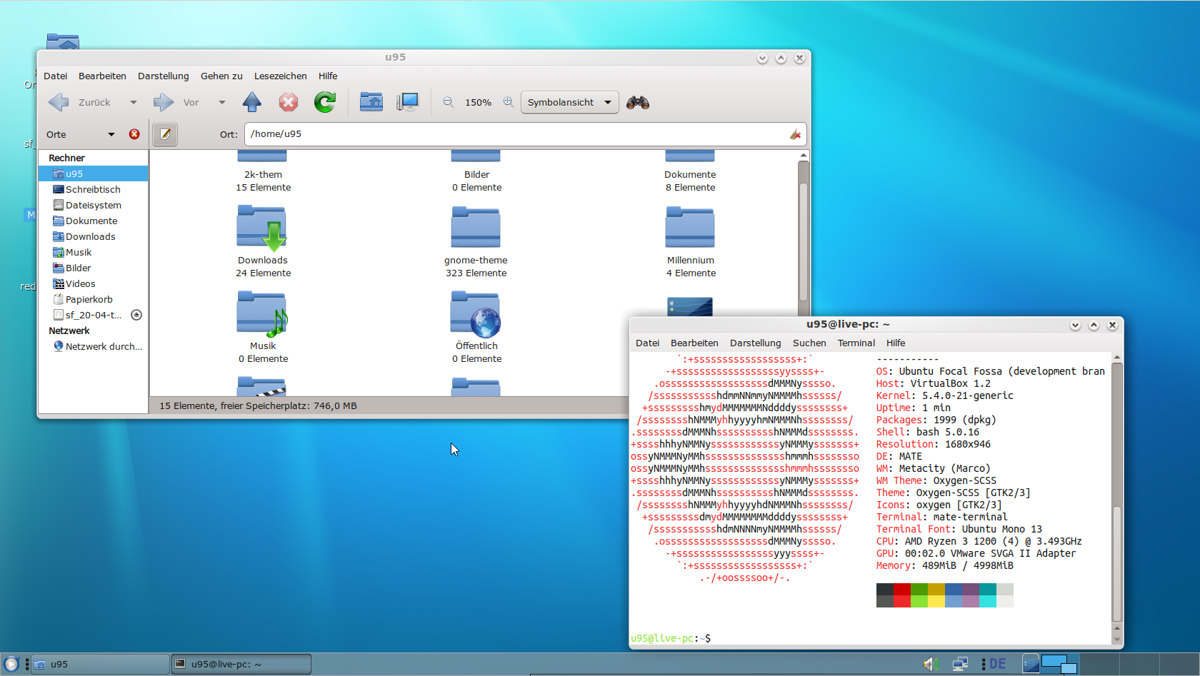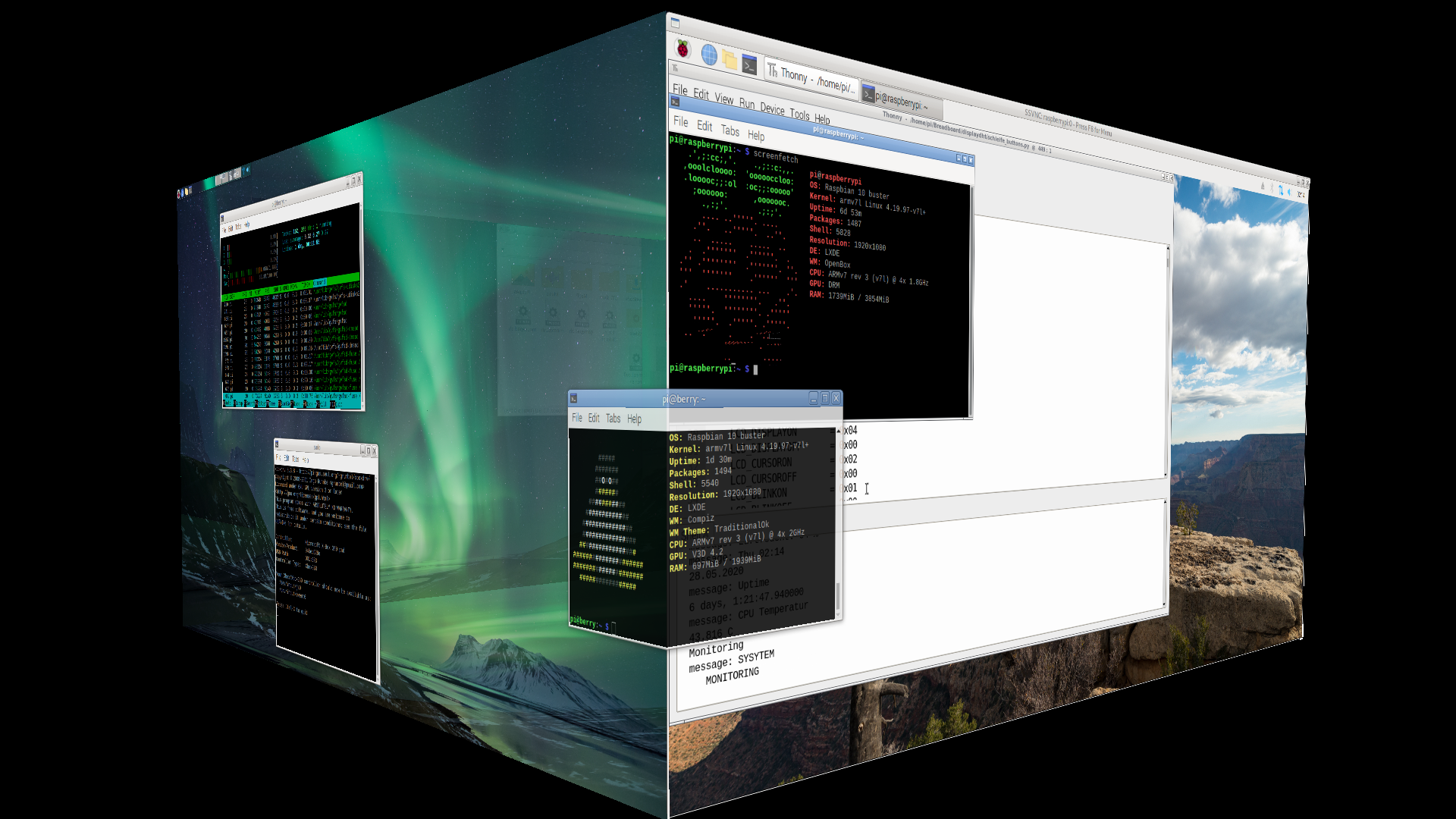 Zweimal Raspbian 10 Buster mit PIXEL, rechts headless LXC Server, der auch für Pythonprogrammierung, Kamera- und Netzwerkexperimente benutzt wird, links mein Alltagsraspi mit Compiz (Tux zur Unterscheidung in Screenfetch). Die Effekte kann ich mit Controller steuern, genau wie Spiele und das OS, dank 4" Display (480x800) und Powerbank auch unterwegs. Selbst Streamingdienste können über eine Browsererweiterung benutzt werden. Evtl tausche ich den durch ein 8GB RAM Raspi aus.