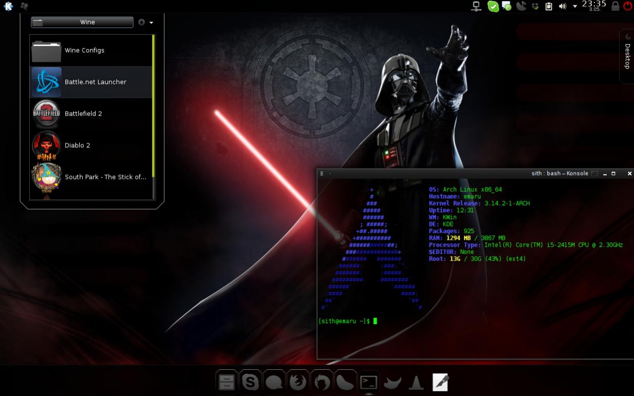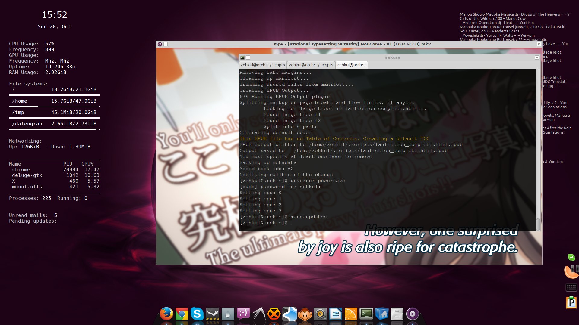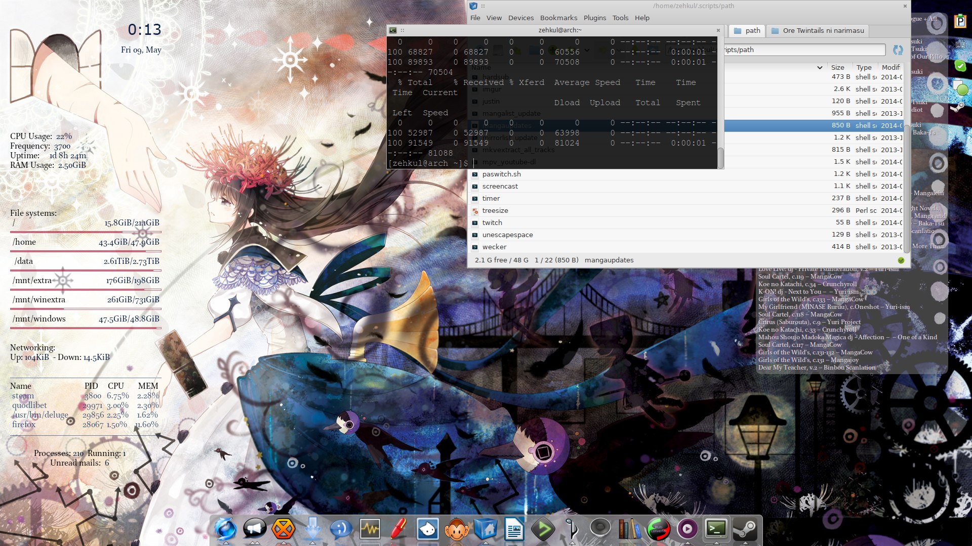 Arch, Openbox, Compton, Conky, eigenes und scheußlich schlecht geschriebenes Script zum Parsen der Updates von Mangaupdates.com, stalonetray, Docky. Und ich suche immer noch nach einem Dock, dass sich auf den Desktop kleben lässt, also immer im Hintergrund bleibt. Stalonetray bleibt schön im Hintergrund.