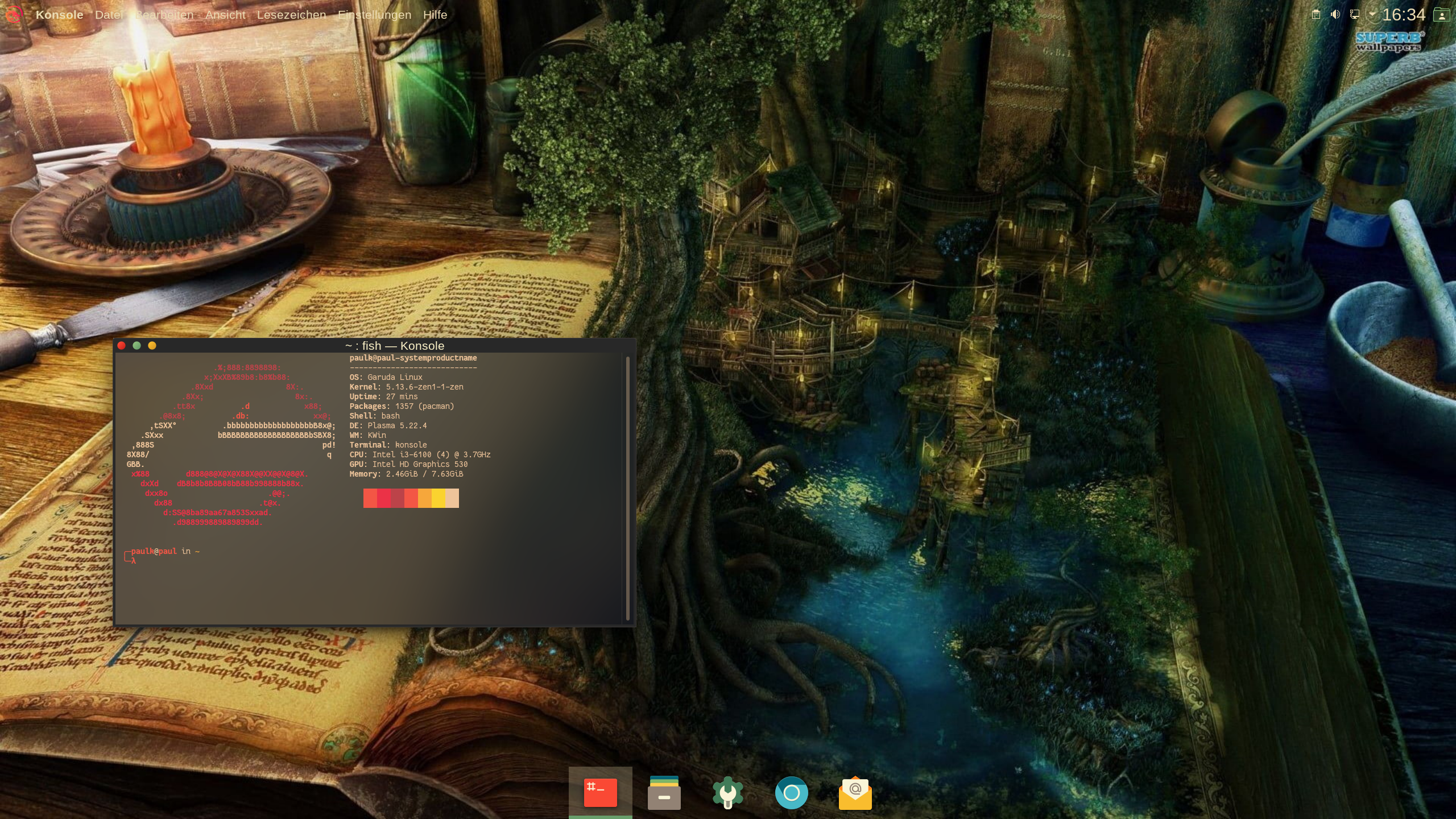 Im Bild ist pop shell aktiv, deswegen kleben die Fenster so schön aneiander, dahinter ist ein Bild eines Waldes mit Bachlauf.
