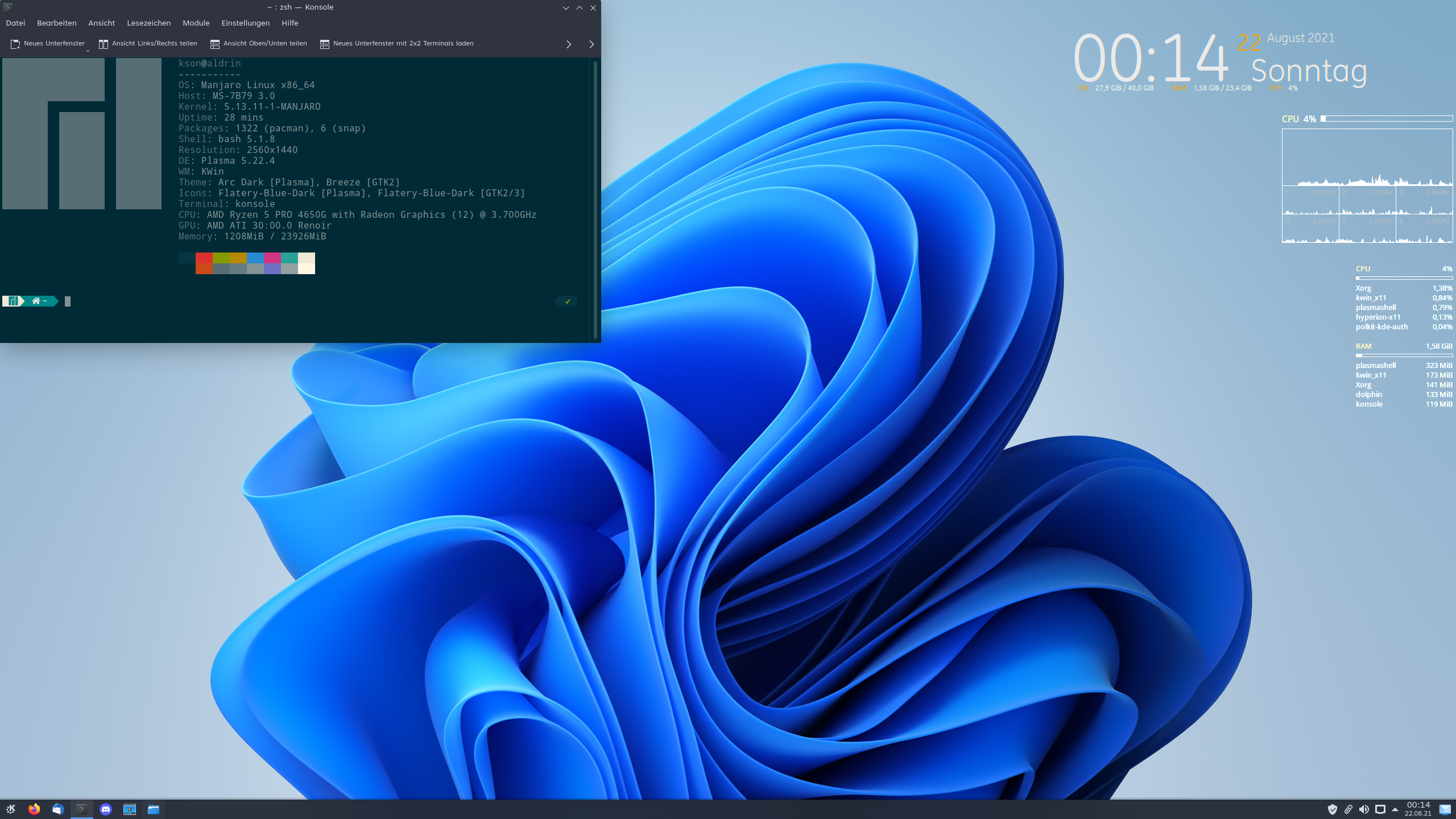 Installiert sind an Extensions; Dash to Panel, Just Perfection, Blur my Shell, User Themes, Weather in the Clock, Pop Shell und Application Menu. Letzteres ist eigentlich nicht notwendig, werd ich mal ausschalten