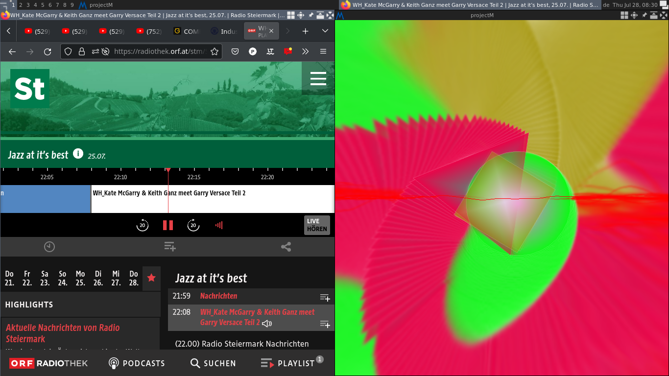 docklike Plugin sammelt diverse App-Icons auf der linken Seite, rechts im Panel sind so Dinge wie Arbeitsflächenumschalter(?), Netzwerk, Clipboard, etc.