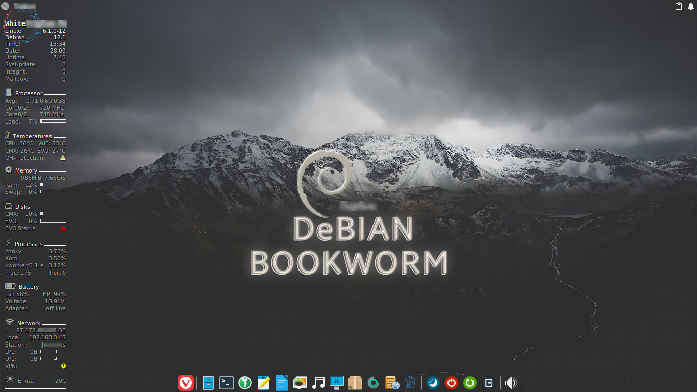 Als GKrellm keine Transparenz mehr bieten konnte, brach für mich eine Welt zusammen. Conky hatte ich nie gemocht, weil es auf einem 13,3" Laptop viel zu groß aussah. Nun ja, ich habe mich dann doch daran gewagt und es in vielen, vielen Wochen einigermaßen an meine Vorstellungen angepasst. So schlank wie nur möglich sollte es sein, der Ressourcenverbrauch sollte sich in Grenzen halten, und die Funktionen, die ich gerne wollte, sollten auf jeden Fall dabei sein und auch anständig funktionieren. Ich finde es traurig, dass es keine Transparenz mehr für GKrellm gibt.