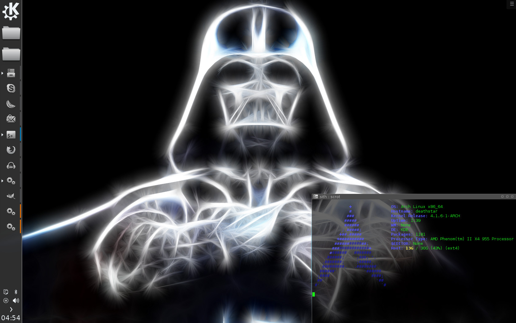 Ich möchte nochmal an den Sinn dieses Threads erinnern, nämlich besonders gestaltete Oberflächen zu präsentieren unter Angabe der verwendeten Software (Distribution, Oberfläche, Widgets usw.) Quasi zur Anregung zum Nachbauen.