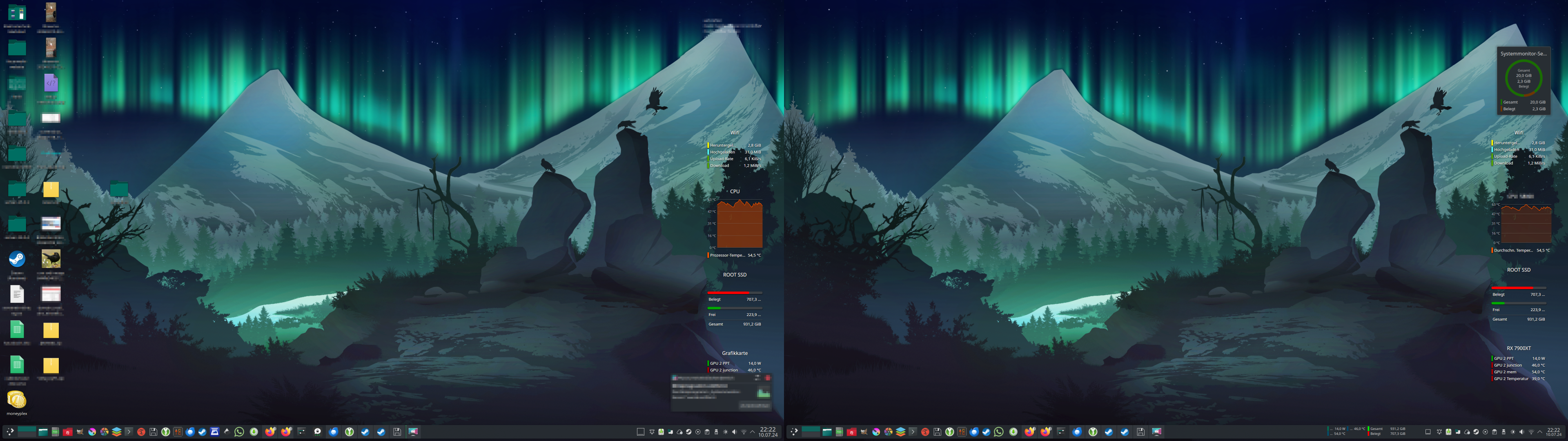 Hier meiner. Ziemlich Standard. Eigentlich nur nen Hintergrundbild aus der AUtomatikfunktion (Jeden Tag ein anderes) und vielleicht das 2x2 Raster Virtuelle Desktops.