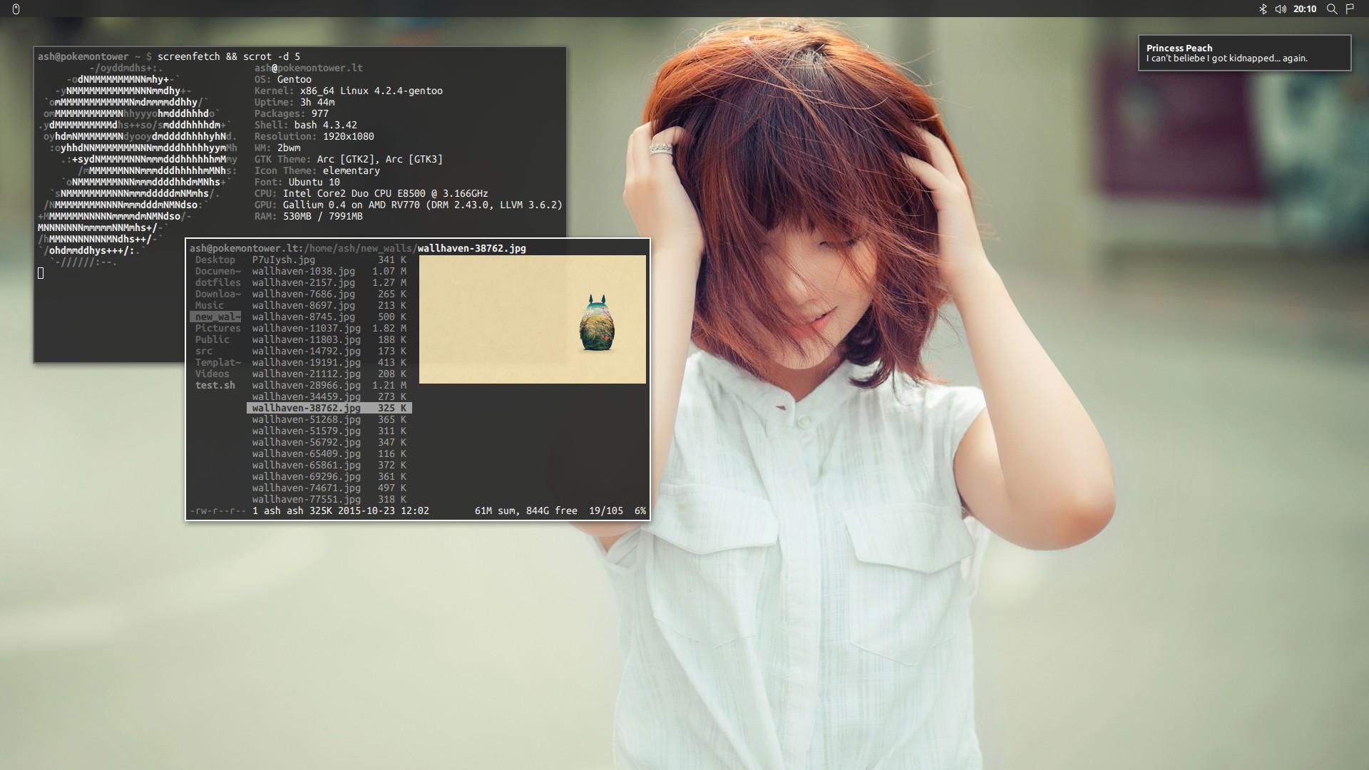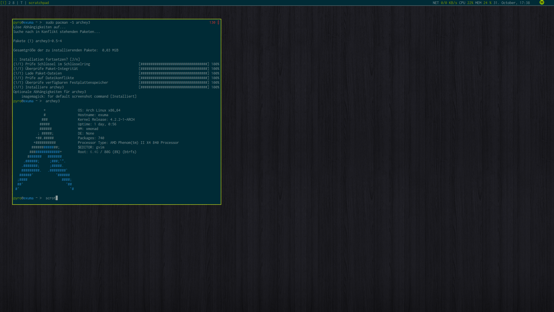 Arch Linux mit xmonad, xmobar und stalonetray. Wallpaper ist aus dem "Wooden Noir 2.0" Package. Früher hatte ich noch so halbtransparente Terminals, inzwischen nur noch das Solarized Dark Theme.