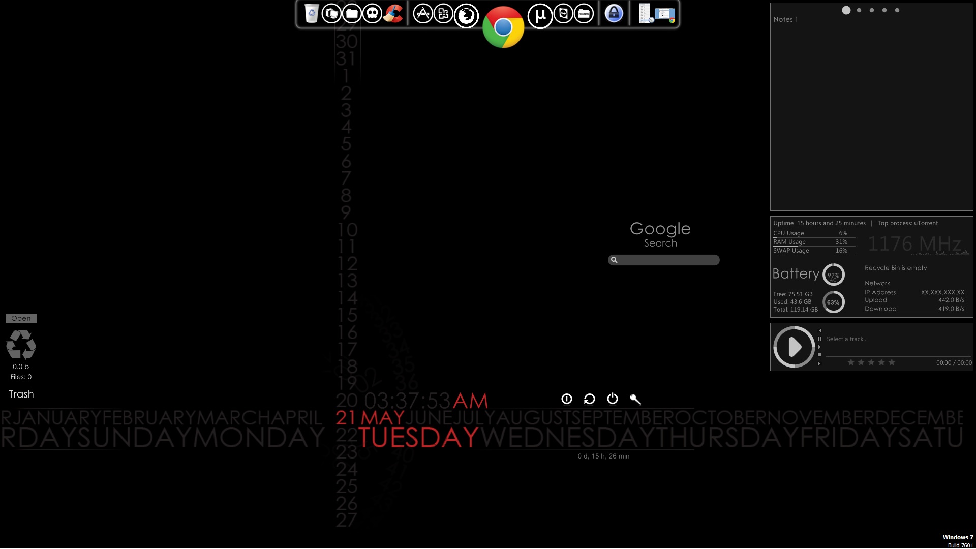 Das Rocket Dock erscheint nur, wenn man mit der Maus an den oberen Rand fährt, genauso wie die Standard Taskleiste unten. Mit dem Button oben rechts laßen sich die rechte und linke Leiste ausblenden.