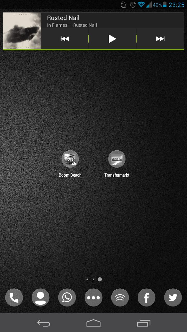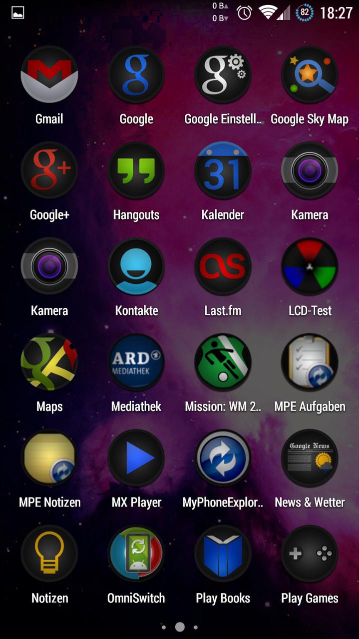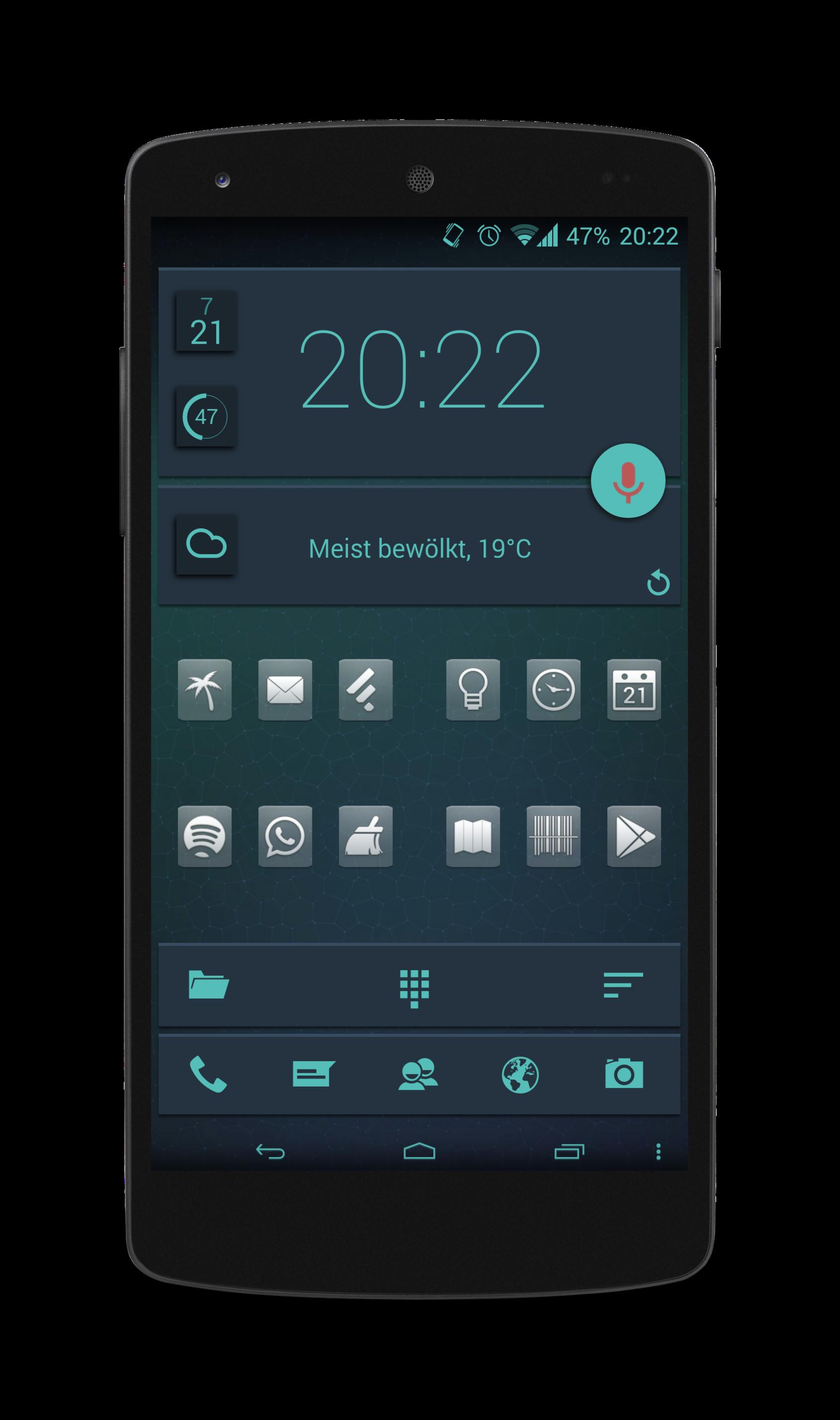 Ich habe das Samsung Galaxy Note II und nutze den Nova-Launcher mit einem 12x7 Grid und die Dock ist deaktiviert. Die Icons sind aus dem Glaskart-Icon Pack, welches du im Store findest.