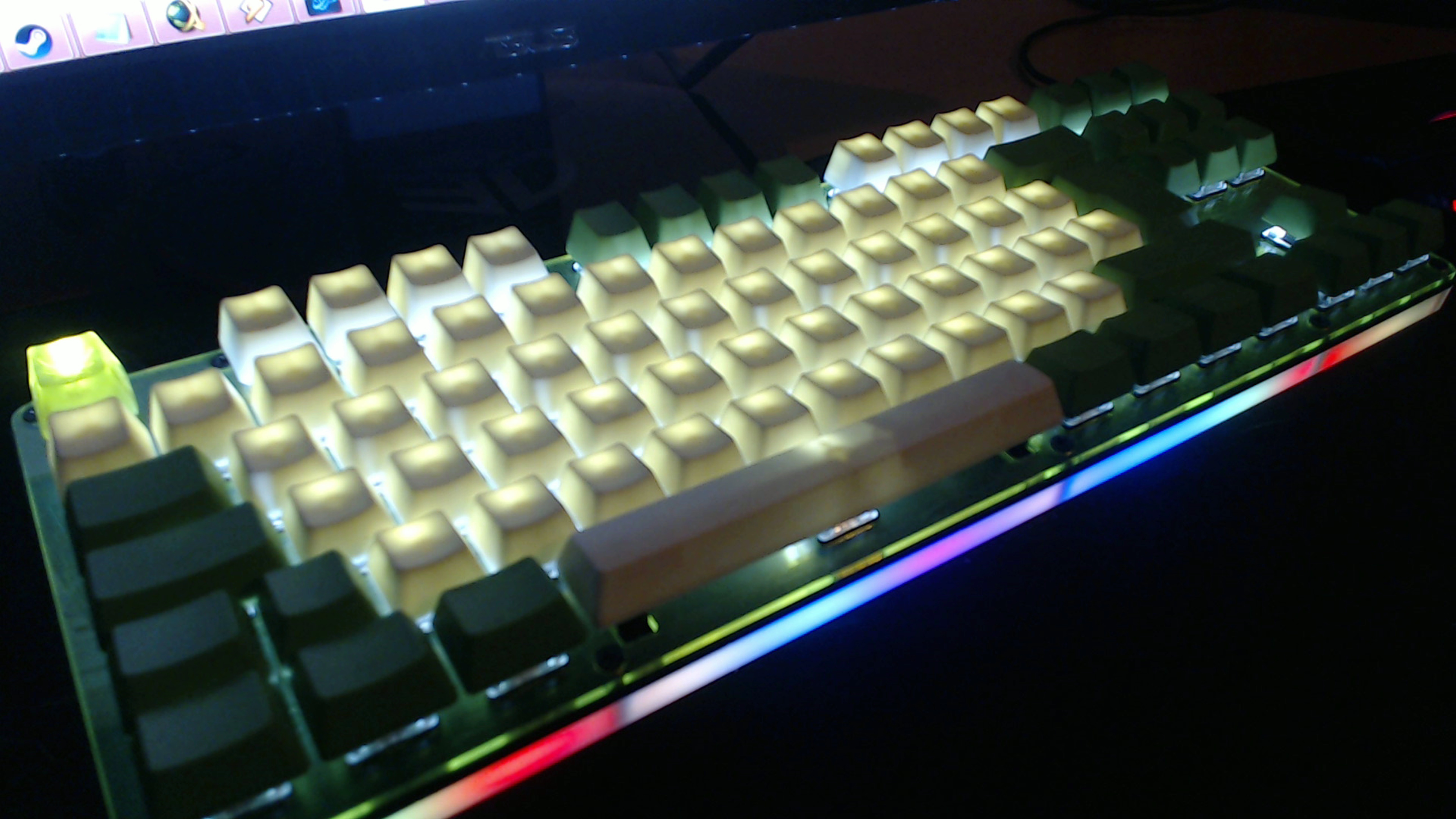 Si, jetzt auch nochmal hier meine Minila Air mit selbst gefärbte Modifier Caps (dye) Bis auf die Leertasten und die Metall- und Linuxcaps ist alles thick PBT undich muss wirklich sagen die Farbkombo gefällt mir richtig gut. Jaja, Eigenlob stinkt ^^