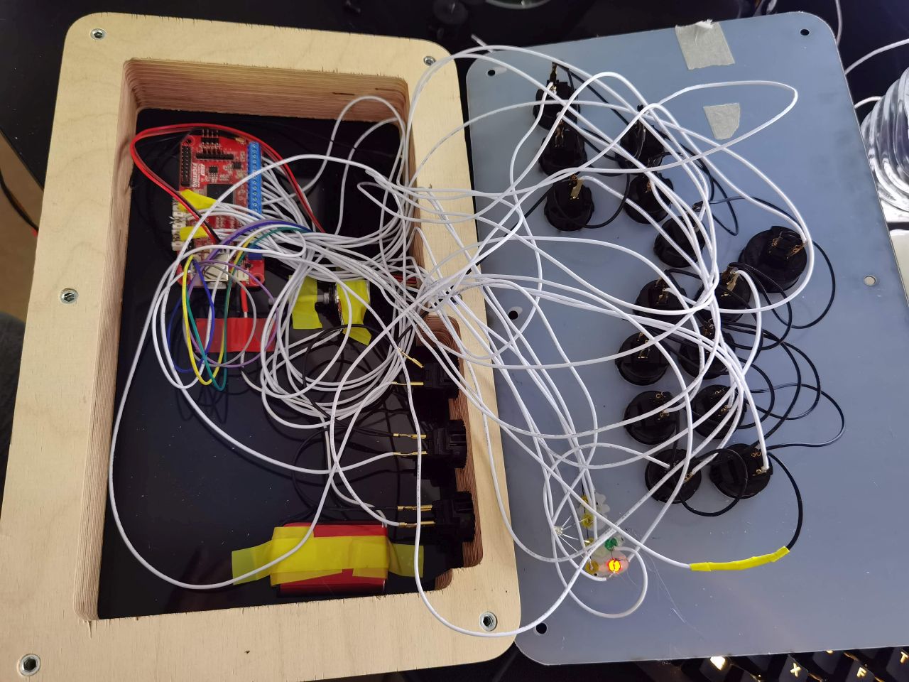 Es handelt sich um eine Art Arcade-Stick, wo aber der Stick durch weitere Buttons ersetzt wird. Dies ermöglicht es typische Streetfighter-Eingabe (z.B. Hadouken) wirklich binnen Millisekunden auszuführen. Das Ganze ist wohl vor ein paar Jahren mal auf Kickstarter losgegangen, aber der Hersteller ist ständig ausverkauft, mit Versand und Zoll landet man über 300 EUR und wann das Teil dann mal kommt ist fraglich. Also habe ich auf arcadeforge.de ein leeres Gehäuse gekauft, dazu ein Brook Wireless Fighting Board und ein paar LEDs geordert und losgebohrt und gelötet. Innen sieht es natürlich aus wie Kraut und Rüben, da mir viele der Stecker fehlten und ich dann stets direkt mit meinem 20 EUR Lidl-Lötkolben auf die Pins gelötet habe, statt mit klebenden PCB-Abstandhalter mit der Heißkleberpistole zu werke gegangen bin und das Bohrloch Treffen war auch nie meine Stärke. Aber hey, es funktioniert und sieht von außen gut, bis auf die eine LED, die ca 2mm verrutscht istDas Poti ist dort drin, weil ich einen Vorwiderstand für die Power-LED benötigte, das erst festgestellt habe, als ich nach dem Bastelladen wieder daheim war und das war halt noch da.