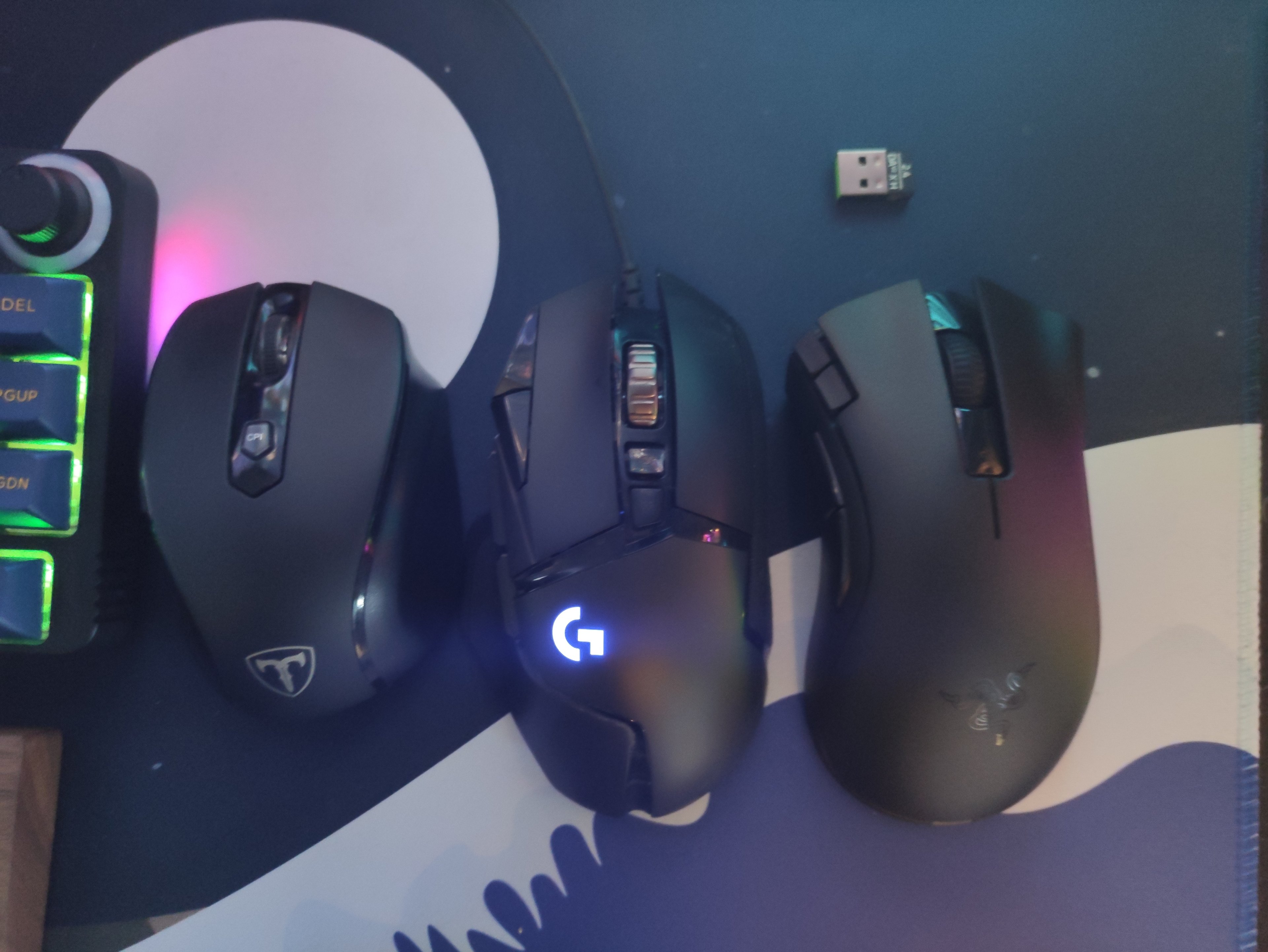 Nachdem mir die letzte Logitech G502 (Mitte) am Doppelklicksyndrom verreckt ist (zum Glück innerhalb der Garantie), hab ich den Ersatz nur noch bis zum Eintreffen der Razer DeathAdder V2 X HyperSpeed (rechts) benutzt. Was soll ich sagen: selbst nur mit Bluetooth gefällt mir die Maus richtig gut beim Zocken. Wichtig waren mir die zwei zusätzlichen Tasten neben der linken Maustaste, die ich von der G502 gewohnt war. Ebenso sollte es kein proprietäres Ladesystem wie Powerplay sein - die Razer schluckt handelsübliche AA- oder AAA-Batterien.
