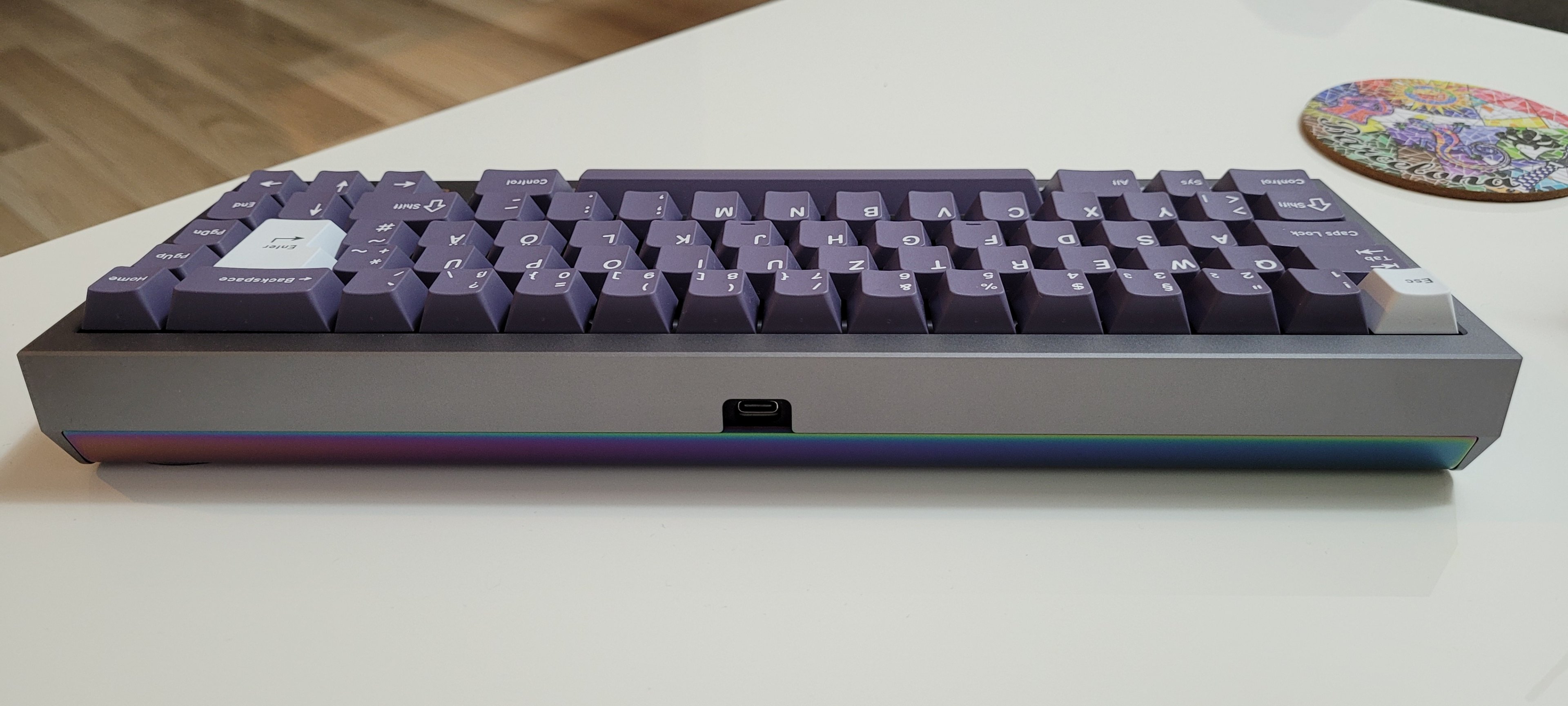 Die Tasten fühlen sich gut an und haben ein mattes, leicht rauhes Finish. Es klingt "klackiger" damit zu schreiben, als mit den noch bis eben verbauten Telelport Tastenkappen. Mir gefällt der Klagn i.V.m. Oilking Switches gut. Im Gehäuseboden ist Silikon ausgegossen und ich habe drüber etwas Wolle und eine dünne Lage Tape untern PCM.