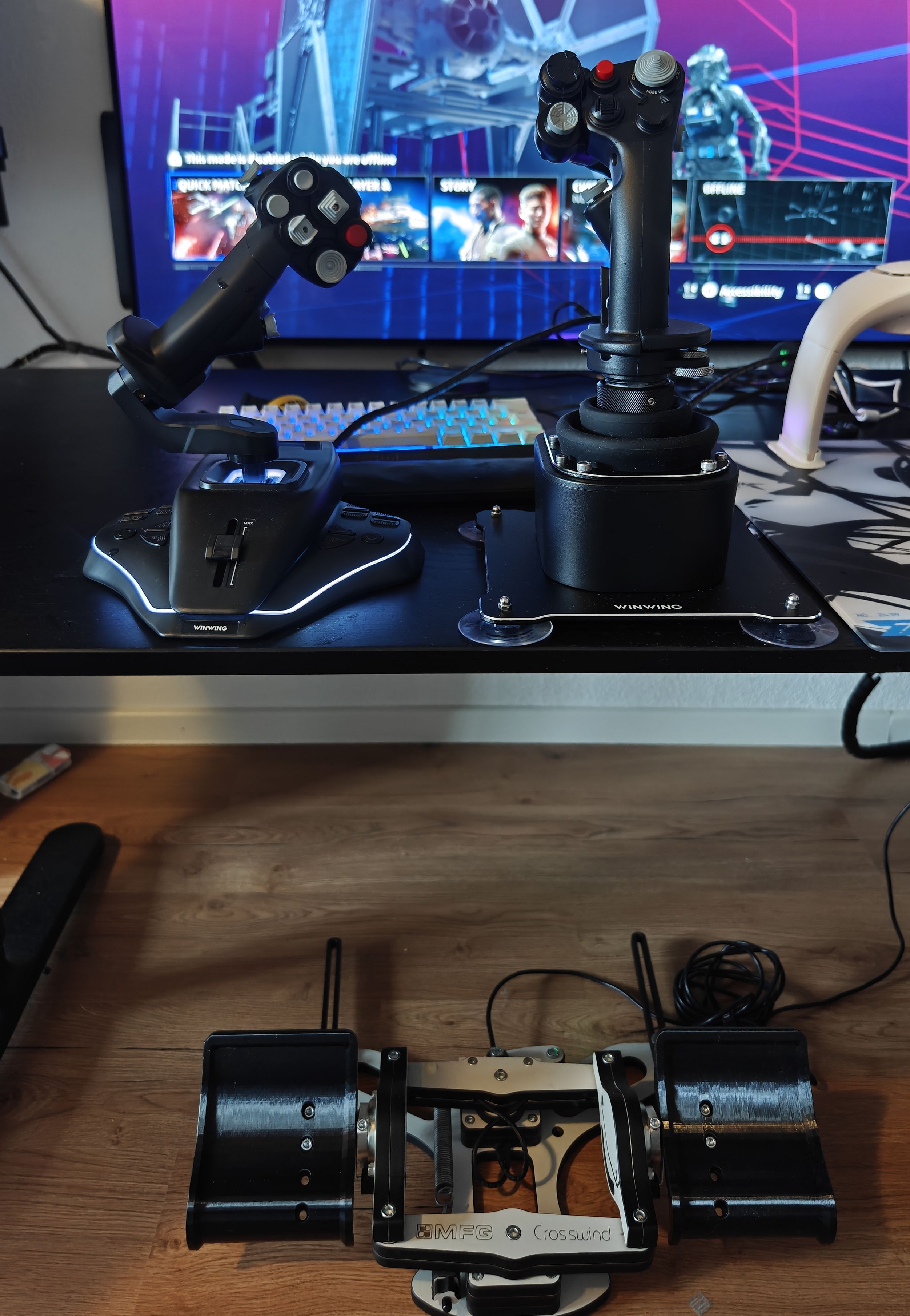 HOSAS – Hands on Stick and Stick, am besten so ein gekrümmter wie mein linker Stick. Vor und zurück ist Schub, links/rechts ist horizontales Strafen, Twist ist vertikales Strafen. Links ist daher die Budget-Variante, für die Bewegung reicht der, rechts der hochwertigere. Günstigere Modelle haben eine deutliche Einkerbung in der Mittelstellung, was präzises Zielen ziemlich schwer macht, wenn man nicht gerade mit Stickverlängerung und Stick zwischen den Beinen spielt wie im richtigen Flugzeug. Dann wird es aber noch wuchtiger und unpraktischer. Daher habe ich mir für die rechte Hand das nächst bessere Modell geholt, das entsprechend smooth ist
