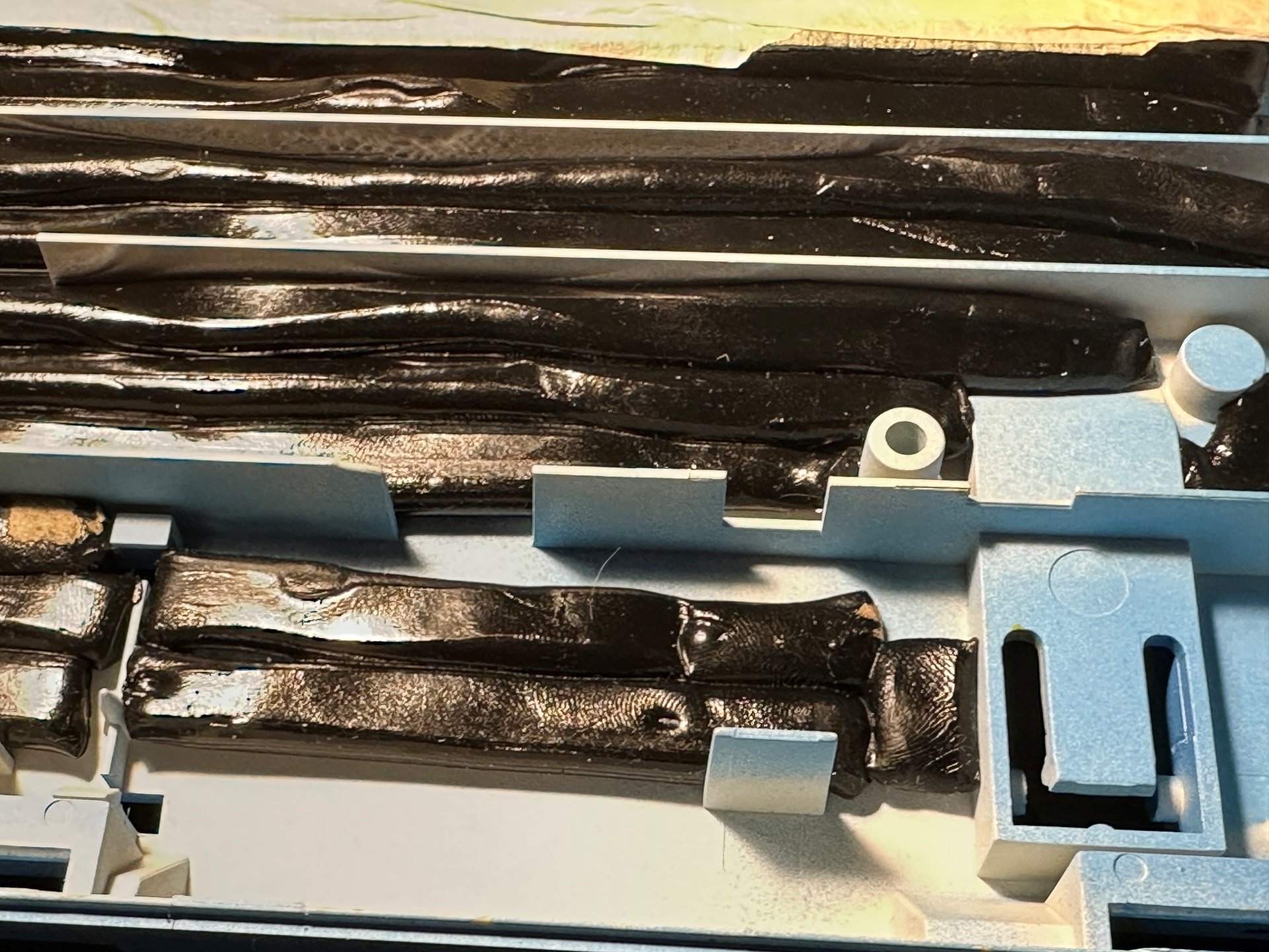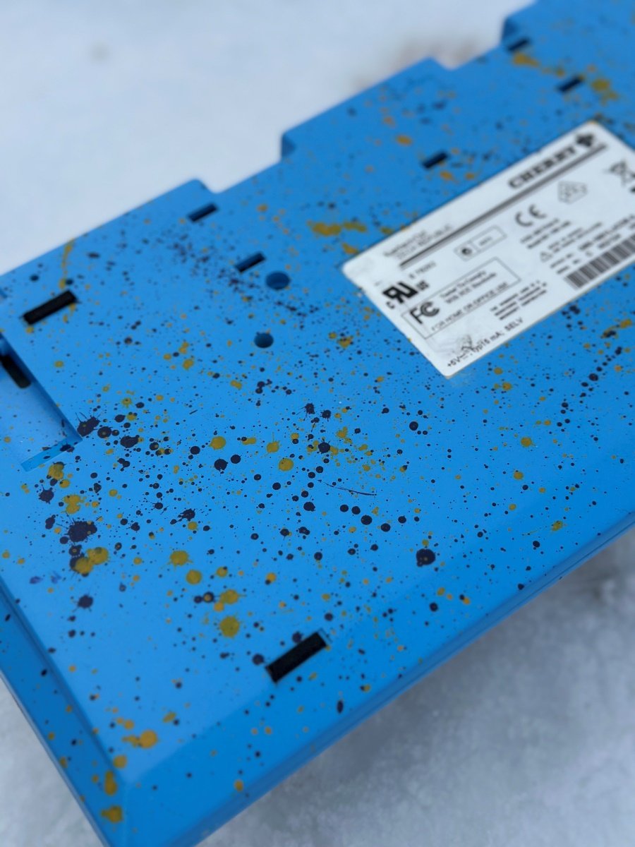 Nach dem auseinanderbauen wurde das Case angeschliffen, mit der Dose grundiert und anschließend mit dem hellen Blau lackiert. Das ist natürlich nicht besonders gut geworden, hat allerdings mir und der Helferin viel Spaß gemacht. Nach dem Trocknen wurden künstlerisch wertvolle Gestaltungselemente in Form von dunkelblauen und gelben Klecksen auf der Unterseite sowie im oberen Bereich der Vorderseite aufgebracht. Nach dem Trocknen gab es noch ein paar Schichten Klarlack. In die Unterseite habe ich Butylrundschnur geklebt. Die ließ sich gut verarbeiten, ist schwer und schluck den Schall. Allerdings stinkt sie noch ein paar Tage nach der Verarbeitung und ist recht klebrig. Nach dem auslüften kam deshalb noch eine Schicht Kreppband oben drauf (quasie ein reverse-tapemod), damit die Platine nicht daran festklebt.