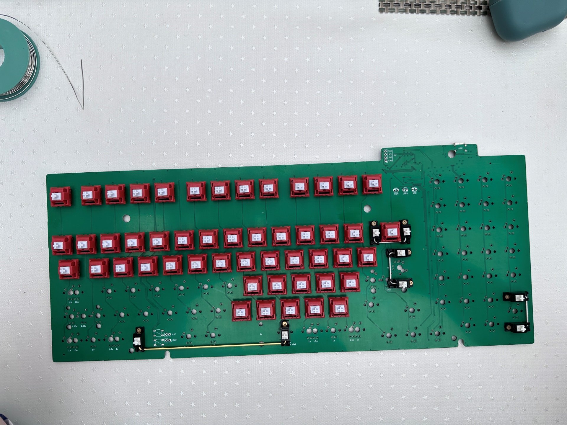 Verbaut ist eine PCB mit USB-C und QMK/Via von ebastler, die für die Cherry G80-1800 Boards designt wurde. Switches sind die Red Velvet Linear von keeb.supply, die mir nicht ganz so gut gefallen wie die Trashies, weil für meinen Geschmack minimal zu schwer (für linears).