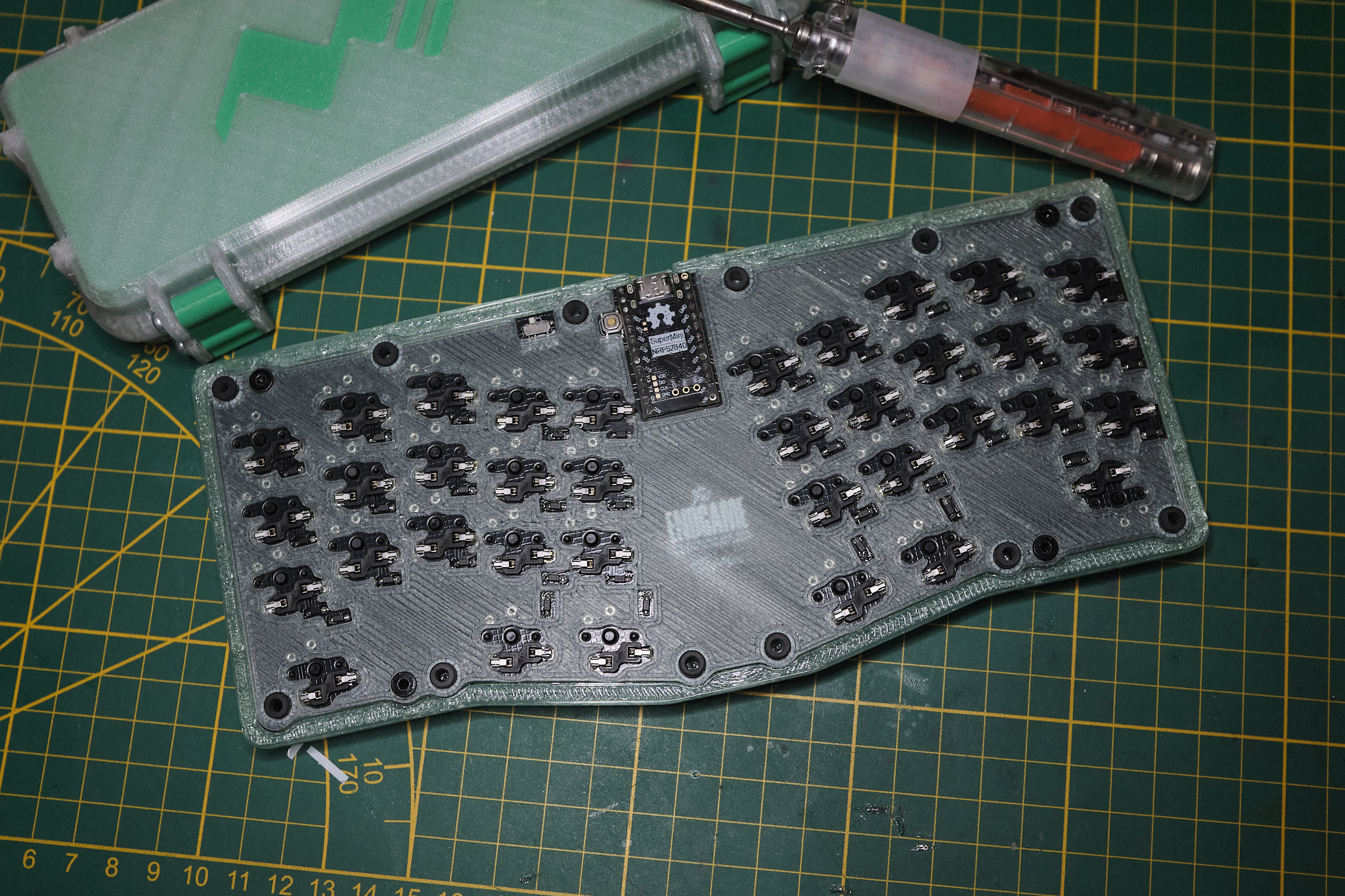 Ich bin mit dem Ergebnis sehr zufrieden! Natürlich ist die Lackierung hundsmiserabel, aber ein perfektes Board war hier nicht das Ziel. Ich freue mich, dass die beiden Blautöne gut mit den Keycaps matchen. Nur das Gelb passt nicht zum blassen gelb der Novelties, aber das stört kaum. Im Moment nutze ich das Board täglich und gern auf Arbeit. Bis wir hoffentlich gemeinsam ein anderes bauen, wird mir dieses auf jeden Fall das liebste bleiben.